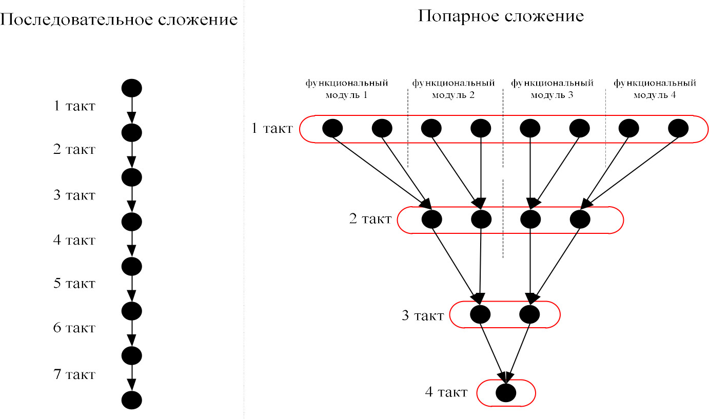 Рис. 4. Преобразованный граф алгоритма в ярусно-параллельной форме представления и второе – распараллеливанием задач – т. е. преобразовывая отношения между элементами массива. На рис. 5 слева схематично изображена задача сложения элементов, выполненное последовательно за семь тактов, затем то же самое действие, выполненное параллельно попарным сложением с помощью четырех функциональных модулей и за четыре такта