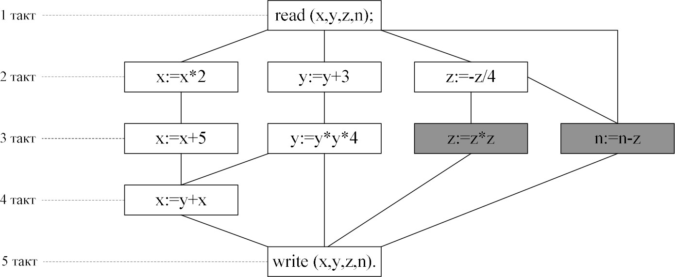 Количество тактов выполнения алгоритма снизилось с 10 до 5. Данное значение является минимумом, выполнить алгоритм за меньшее количество шагов не представляется возможным. Тем не менее здесь задействовано 4 вычислителя. Можно применить ЯПФ для оптимизации алгоритма (рис. 7).