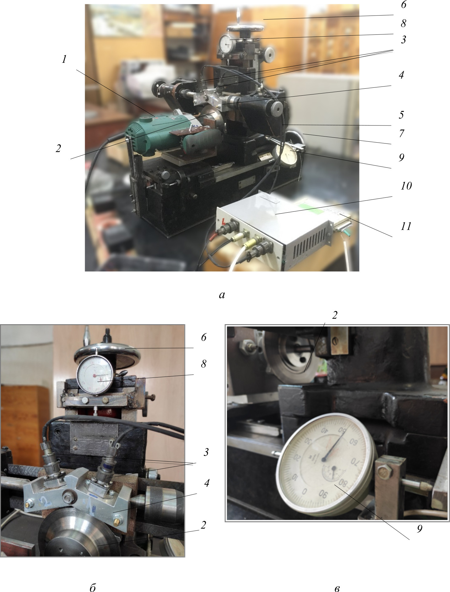 Рис. 1. Лабораторный стенд для экспериментальный исследований прототипа системы контроля состояния РУП ТНА: внешний вид (а), имитатор корпуса ТНА с установленными ОВТД (б), устройство контроля осевых перемещений вала (в): 1 – электродвигатель с регулируемой частотой вращения; 2 – измерительный диск; 3 – кластер из двух ОВТД; 4 – имитатор статора; 5 – координатно-подвижная каретка; 6–7 – маховики, обеспечивающие перемещение имитатора статора в вертикальном (6) и горизонтальном (7) направлениях; 8–9 – индикаторы часового типа для контроля перемещений имитатора статора в вертикальном (8) и горизонтальном (9) направлениях, 10 – блок преобразования, усиления и нормализации сигналов ОВТД, 11 – выносной модуль АЦП