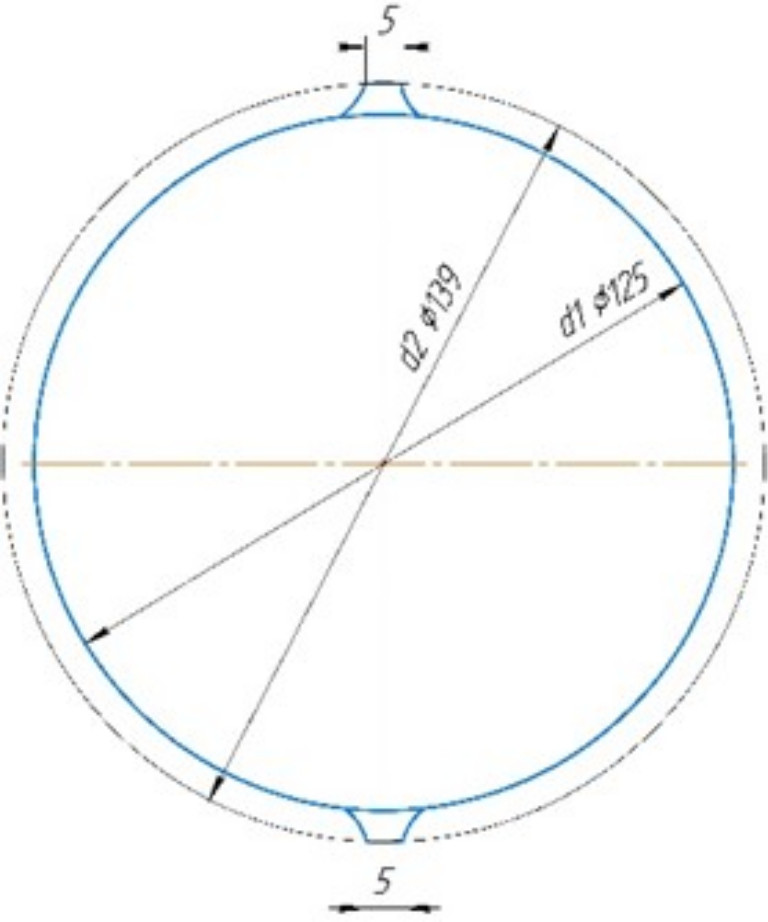 На рис. 4 приведен чертеж используемого в ТНА измерительного диска1 с двумя выступами и указанием основных размеров. Внутренний диаметр диска равен 125 мм, высота измерительного выступа – 7 мм, ширина торцевой части выступа – 5 мм. Как уже отмечалось, в качестве АЦП в прототипе системы контроля РУП используется 14-разрядный выносной модуль E14-440 фирмы L-Card [11], который работает с максимальной частотой преобразования, равной 400 кГц. Предполагалось, что минимальная частота вращения ротора ТНА была равной 8000 об/мин, а номинальная – 20000 об/мин.