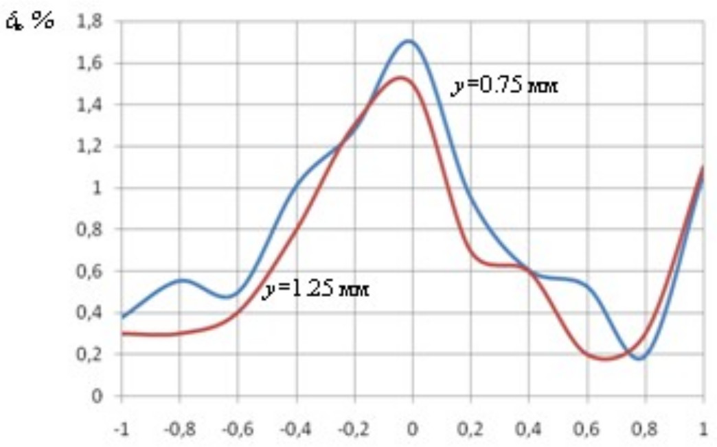 Результаты расчета вычислительной погрешности для двух значений радиальных зазоров при изменяющихся осевых перемещениях вала в РУП ТНА (измерительного диска) представлены в графическом виде на рис. 6.