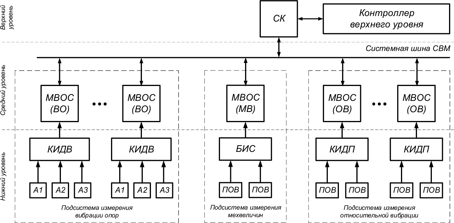 Каждая подсистема может включать несколько идентичных групп каналов, предназначенных для измерения функционально связанных однотипных параметров. Примерами таких параметров могут служить ортогональные составляющие вибрации одной опоры, одной шейки ротора и некоторые другие. Каждая группа обслуживается одним контроллером интеллектуального датчика (КИД) и одним модулем ввода, отображения и сигнализации (МВОС), общее количество которых определяется сложностью ТА. Такой подход упрощает масштабирование системы и улучшает её ремонтопригодность. Каждый МВОС может функционировать независимо от других модулей среднего уровня, но для реализации в полном объёме функций сигнализации и защиты ТА, обеспечения передачи данных на верхний уровень СВМ и взаимного контроля работоспособности МВОС взаимодействуют между собой с помощью системной шины (СШ).