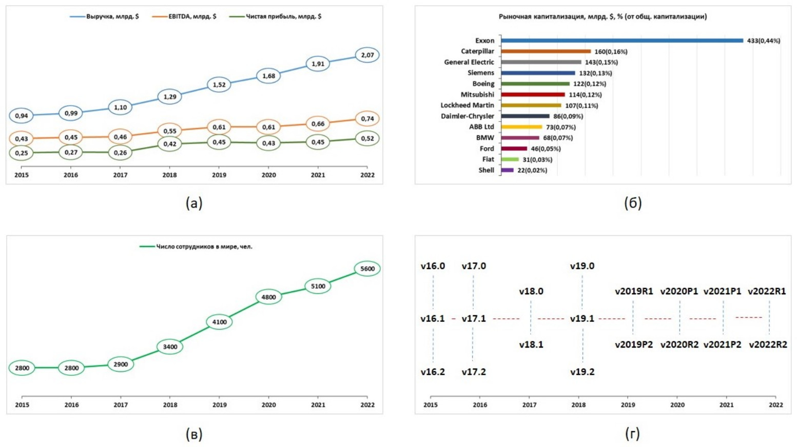 Рис. 2. Статистический анализ ПП ANSYS: а – ключевые финансовые показатели ANSYS.Inc [21]; б – основные потребители ПП ANSYS [22]; в – число сотрудников в ANSYS.Inc [21]; г – версии ПП ANSYS за период 2015–2022 гг.
