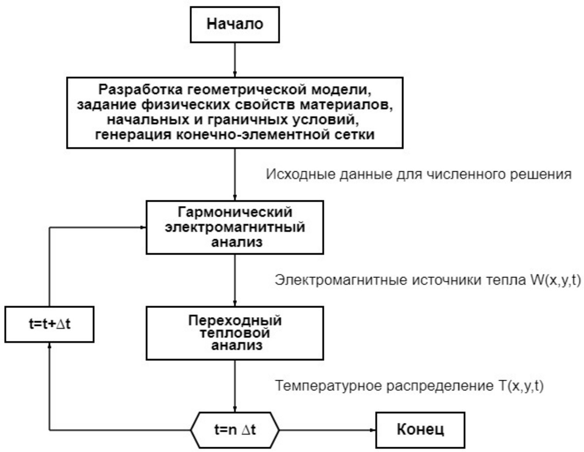 после которых происходит итерационное решение задач электромагнитного и теплового анализа (рис. 3) [24].