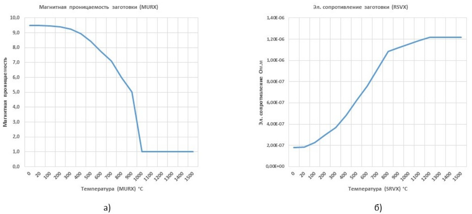 Температура (MURX) ºC | Магнитная проницаемость заготовки (MURX), [1] | Магнитная проницаемость проводника (MURX), [1] | Температура (RSVX) ºC | Электрическое сопротивление заготовки (RSVX), [Ом∙м] | Электрическое сопротивление проводника (RSVX), [Ом∙м] |