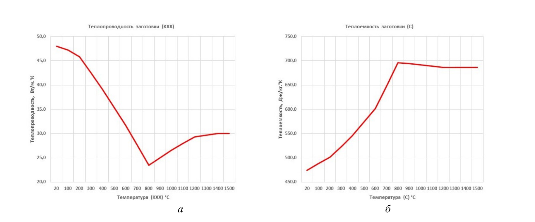 Рис. 5. Теплофизические свойства стали С45: а – зависимость теплопроводности от температуры; б – зависимость теплоемкости от температуры