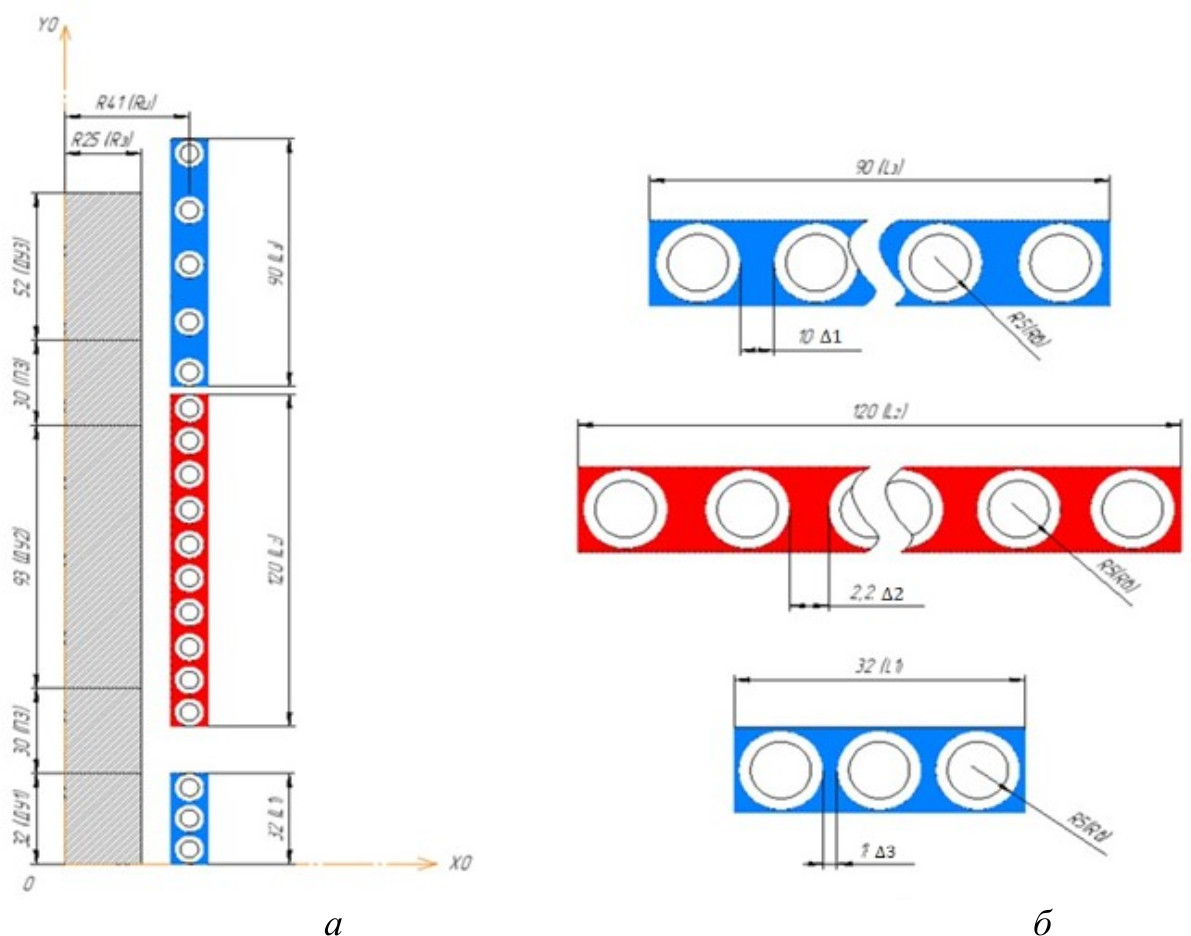 Разрабатываемая численная модель ориентирована на её последующее использование в процедуре решения оптимизационной задачи, обеспечивающей достижение заданного конечного температурного распределения на поверхности заготовки (см. рис. 1, б) с максимальной точностью. Это проявляется в специфических требованиях к проектированию ИНУ. В соответствии с заданным неравномерным температурным профилем проектируется трехсекционный индуктор (рис. 6, б), каждая секция которого характеризуется собственным набором параметров: длиной секции , числом равномерно расположенных в пределах каждой секции витков и значением питающего тока .