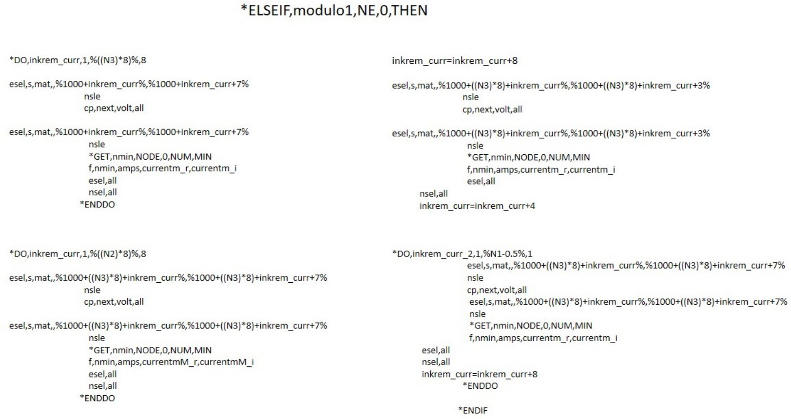 В связи с тем, что проектируемая геометрическая модель является осесимметричной, возникает особенность в присвоении тока виткам первой секции индуктора. В случае, когда при осесимметричном рассмотрении первой секции число витков представляется дробным значением (при симметричном делении длины и числа витков пополам), значение округляется до целого числа. На рис. 7 и 8 представлены программные коды, реализующие присвоение токов элементам и узлам геометрической модели в случаях целочисленного и дробного значений соответственно.