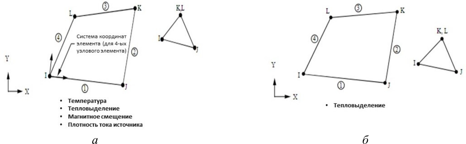 Рис. 9. Схематичное изображение КЭ численной модели процесса зонного индукционного нагрева: а – КЭ типа PLANE13; б – КЭ типа PLANE55