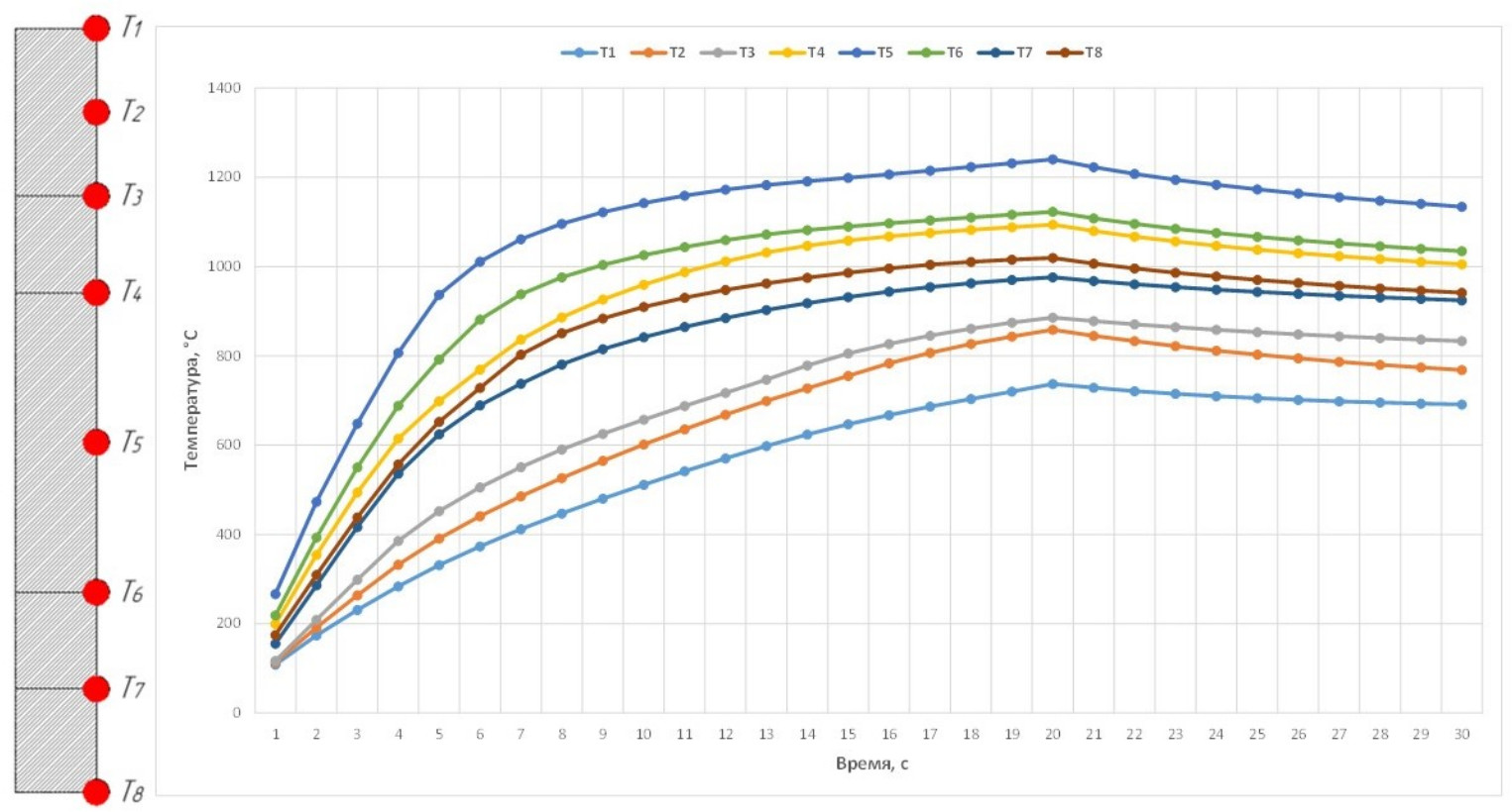 Для анализа изменения температуры во времени выбраны 8 характерных точек (рис. 11), равномерно расположенных на поверхности заготовки. Изменение температуры во времени в характерных точках позволяет определить возможный момент достижения заготовкой критической температуры , при которой происходит недопустимый перегрев стали, и отображает описанное выше температурное выравнивание, начинающееся с момента времени с (см. рис. 11).