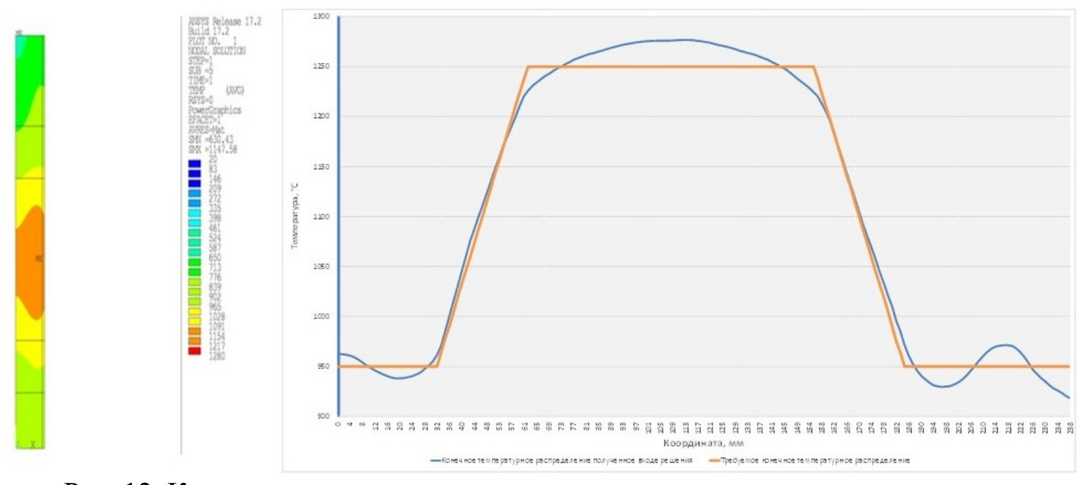 Рис. 12. Конечное температурное распределение на поверхности заготовки, полученное в ходе численного решения, в сравнении с требуемым конечным температурным распределением
