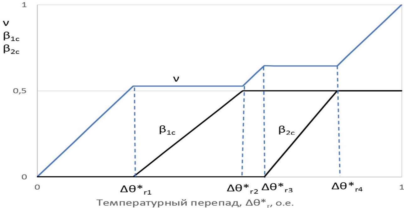 из выражений (6) находим зависимости требуемого относительного числа включенных двигателей вентиляторов от относительного температурного перепада: