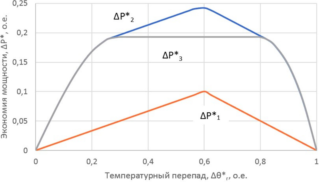 Рис. 2. Зависимости экономии мощности от требуемого температурного перепада: – рациональное дискретное управление; – оптимальное комбинированное управление; – комбинированное управление для