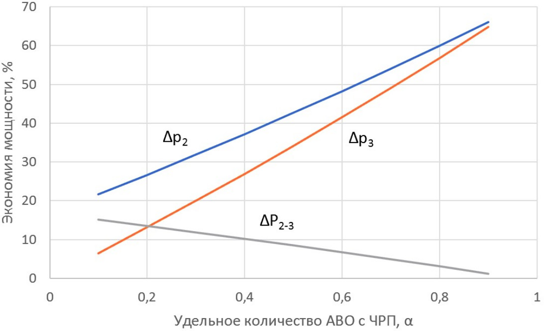 Рис. 3. Зависимости относительной экономии мощности от удельного количества АВО с ЧРП: – оптимальное комбинированное управление; – комбинированное управление для ; – дополнительная экономия мощности