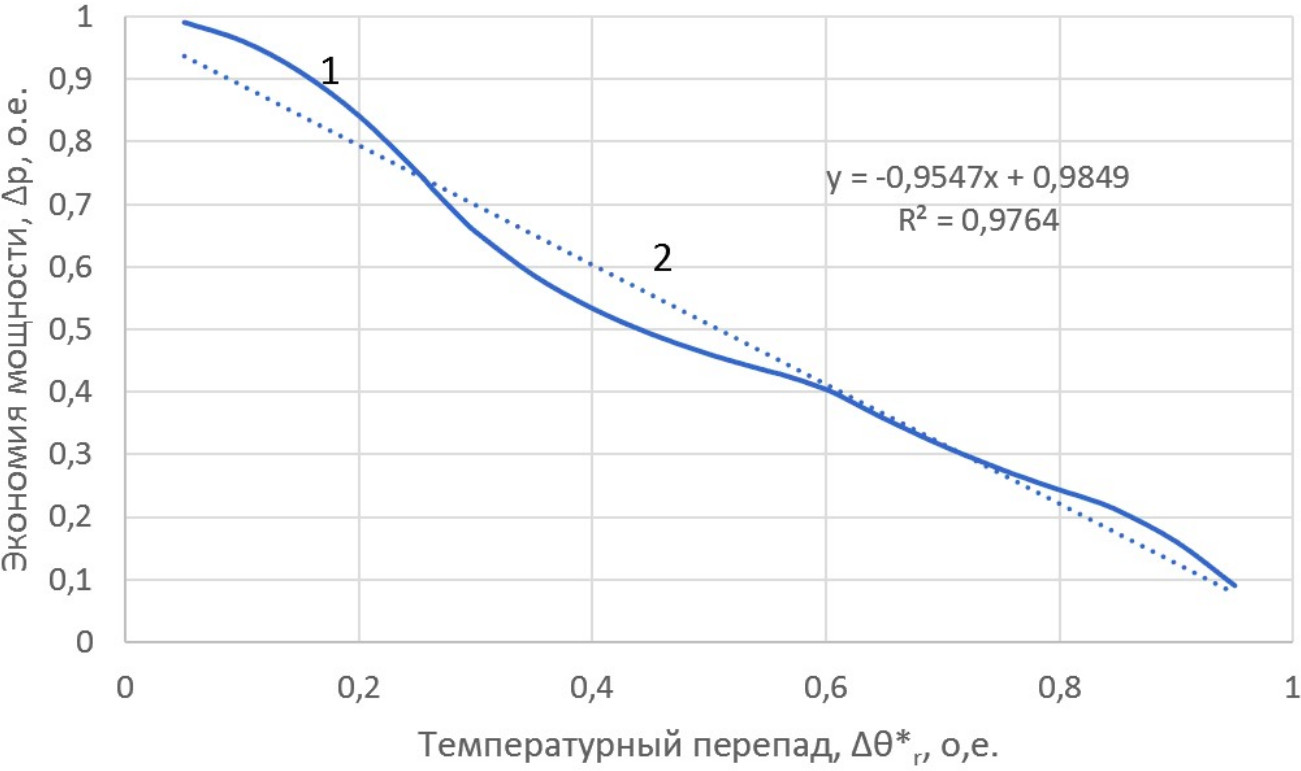 Рис. 4. Графики зависимости экономии мощности от требуемого температурного перепада: 1 – оптимальное комбинированное управление ; 2 – линейная аппроксимация