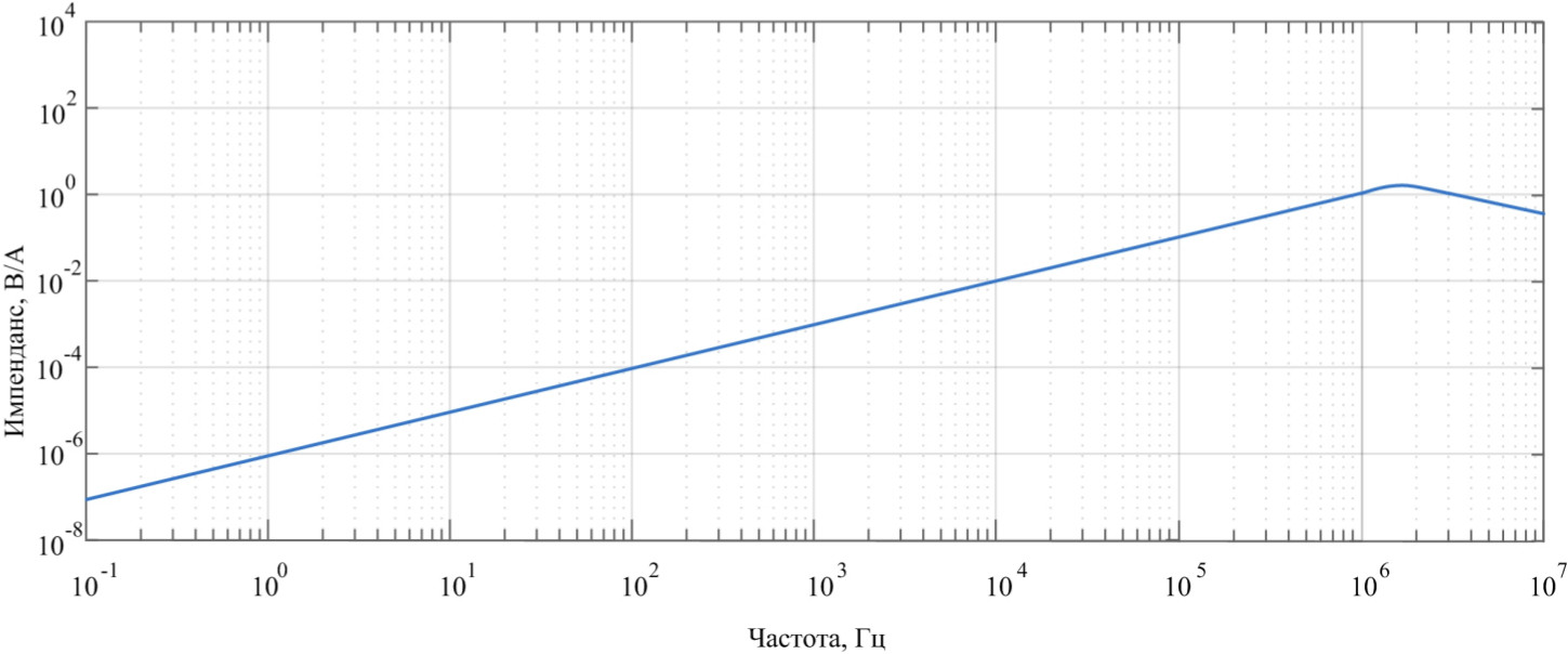 Расчетные параметры катушки Роговского: взаимная индуктивность мкГн; индуктивность мкГн, сопротивление Ом и емкость нФ. Частотная характеристика катушки Роговского с измерительным кабелем и шунтирующим резистором рассчитана по формуле (1) и представлена на рис. 2.