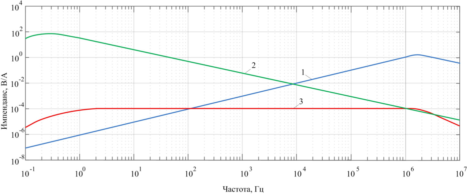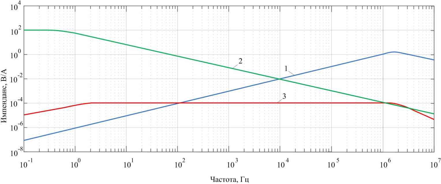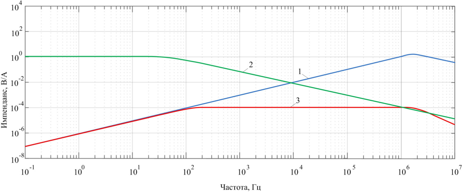 Частотная характеристика измерительной системы с катушкой Роговского и пассивным RC-интегратором представлена рис. 4. На рисунке обозначены: 1 – величина передаточного импеданса катушки Роговского; 2 – величина коэффициента передачи интегратора; 3 – коэффициент передачи всей измерительной системы. Из графика следует, что fL составляет около 100 Гц, а fH – около 2 МГц.