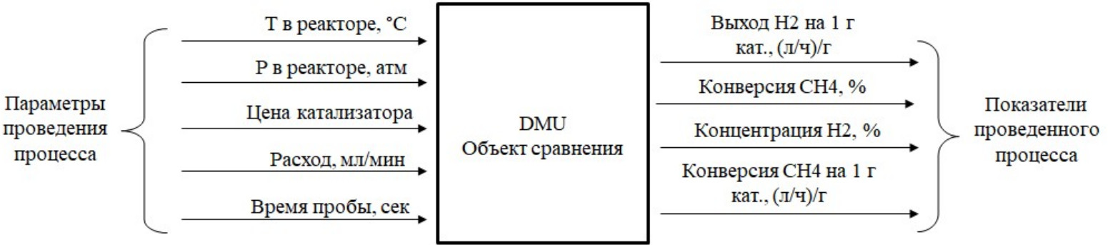 В данной статье было принято, что каждый замер отдельного эксперимента с определенным катализатором и заданными технологическими условиями рассматривается как единица принятия решения (DMU), представляющая собой объект сравнения с определенным набором входных и выходных параметров. В качестве компонентов вектора входа выбраны параметры, характеризующие затраты на реализацию технологического процесса и условия его проведения: