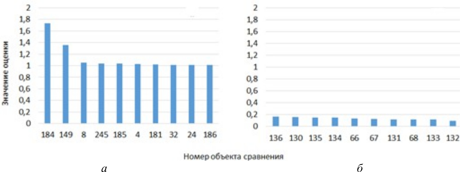 В результате решения 247 ЗМП с помощью специализированного программного обеспечения каждый объект сравнения получил соответствующую ему оценку эффективности. На рис. 3 представлены значения оценок эффективности для объектов сравнения, получивших максимальные и минимальные оценки в группе сравнения.