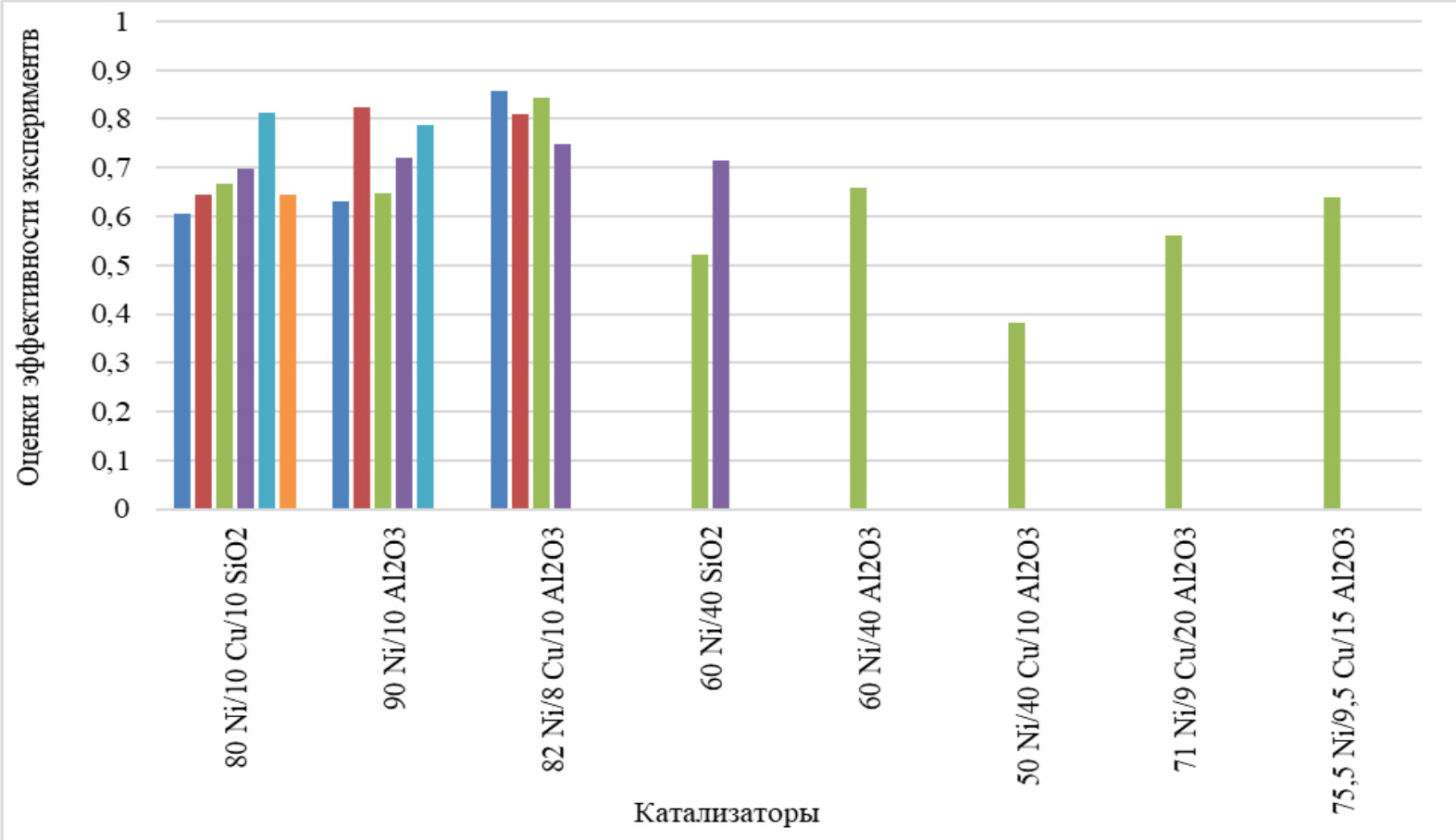 Рис. 4. Усредненные значения оценок эффективности экспериментов с различными катализаторами