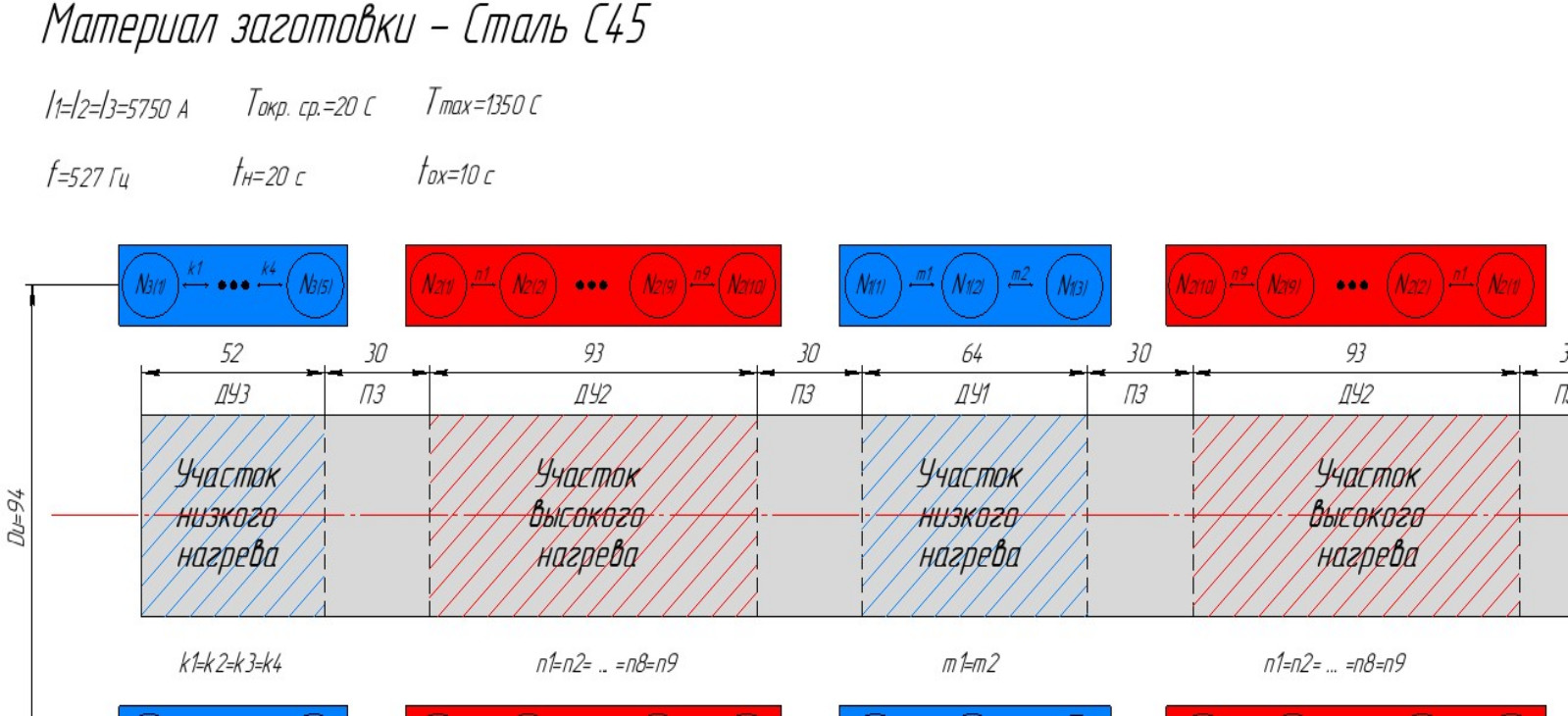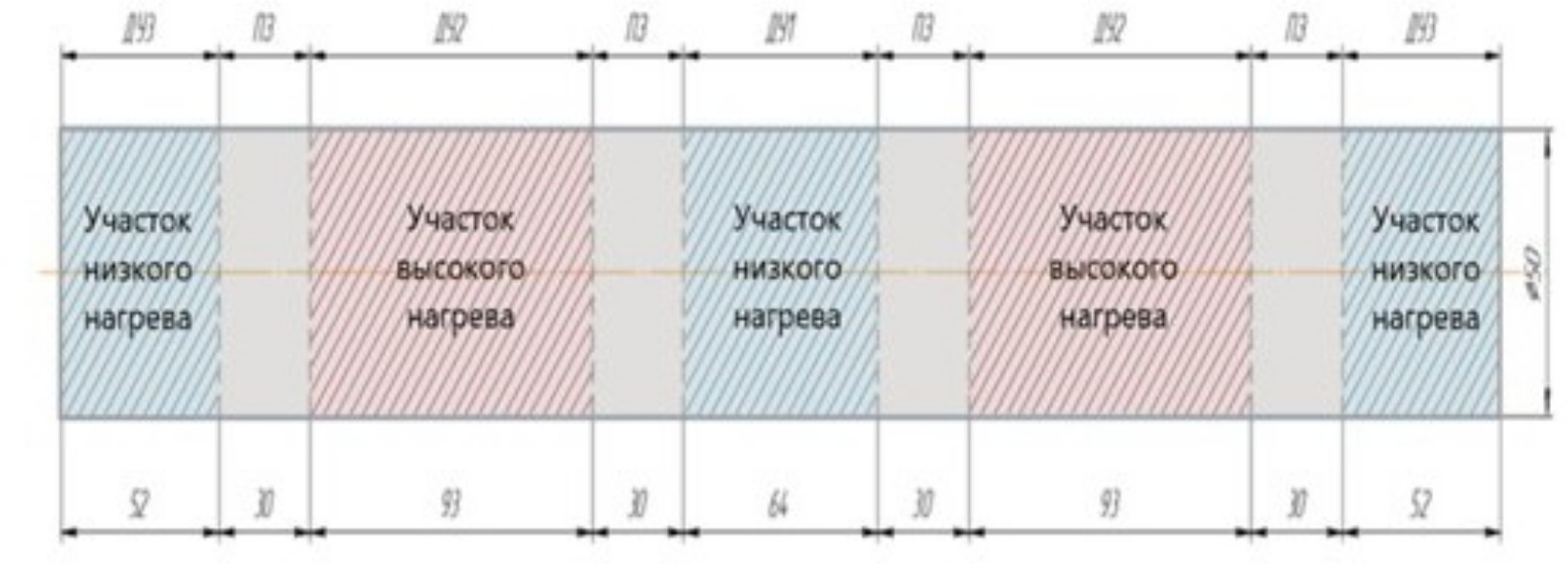 Стальная заготовка представляет собой полуфабрикат для изготовления вала ответственного изделия путем обработки давлением, перед которой она должна быть нагрета с высокой точностью до температуры, требуемой для качественного формоизменения. На рис. 1 выделены участки нагрева по длине заготовки: ДУ1 – длина первого участка нагрева (64 мм), ДУ2 – длина второго участка нагрева (93 мм), ДУ3 – длина третьего участка нагрева, ПЗ – переходная зона (30 мм).