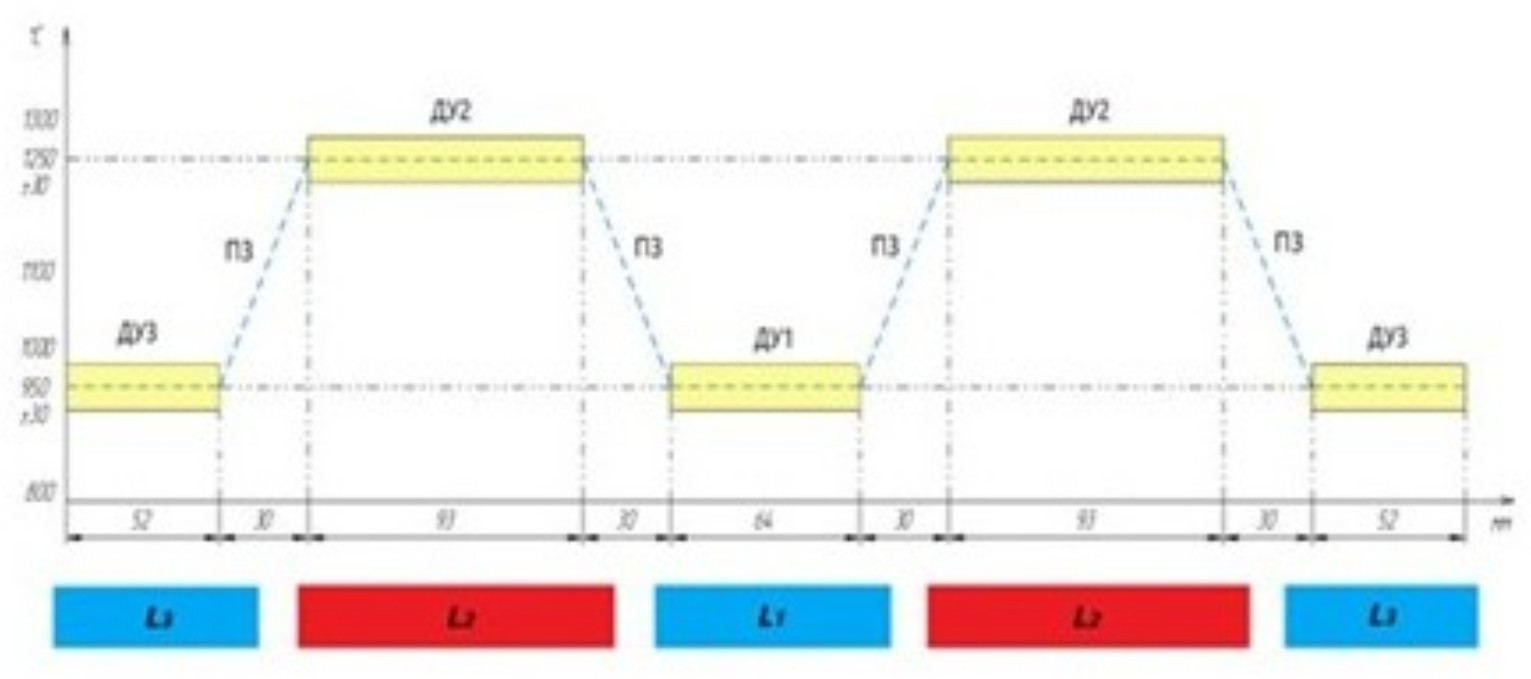 Участки активного нагрева ДУ2, которые подвергаются операциям обкатки и прессования, требуется нагреть до 1250 ºС с допустимым отклонением температуры ±15ºС. Участки нагрева ДУ1 и ДУ3 нагреваются до меньшей температуры – до 950 ºС (с допустимым отклонением температуры ±15ºС) с целью сохранения температурного перепада. Максимальная допустимая температура нагрева стальной заготовки составляет 1350 ºС − температура плавления стали, минимальная температура нагрева заготовки перед операциями пластической деформации 700 ºС − это температура, по достижении которой снимаются внутренние напряжения [15]. Такого рода профиль рационально применять для термообработки ответственных изделий в машиностроении (например, валов), где пластической деформации подвергаются конкретные участки по длине заготовки, что в массовом производстве позволит существенно снизить энергетические затраты. Данный подход принципиально отличается от типового сквозного равномерного нагрева заготовки перед обработкой давлением и приводит к существенному усложнению технологического процесса.