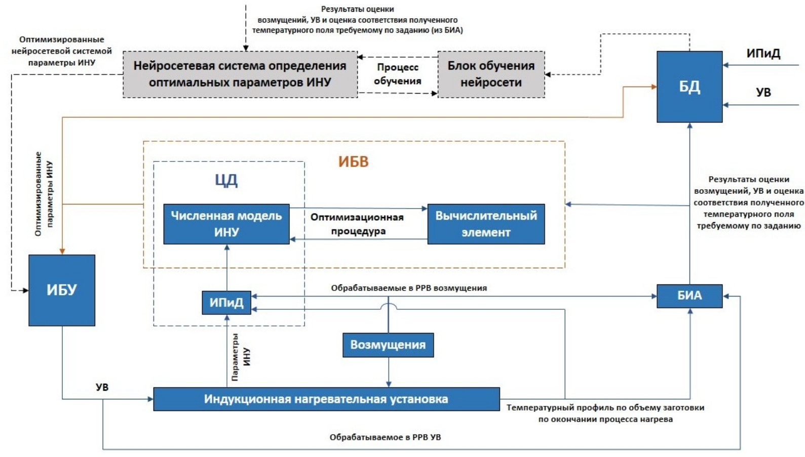 Результат работы БИА передается в интеллектуальный блок вычислений (ИБВ), задача которого состоит в поиске оптимальных параметров ИНУ, значения которых позволяют получить требуемый по техническому заданию температурный профиль на поверхности нагреваемой заготовки. Поиск оптимальных параметров ИНУ происходит с использованием оптимизационной процедуры, основанной на совместной работе численной модели ИНУ (реализованной в специализированных программных пакетах для численного моделирования) и вычислительного элемента, представляющего собой пакет прикладных программ для высокосложных математических вычислений. При этом численная модель ИНУ постоянно актуализируется при взаимодействии с измерительными приборами и датчиками (ИПиД) и, таким образом, формирует цифровой двойник (ЦД) реальной ИНУ. Наличие ЦД в структуре системы является одним из принципиальных отличий КФСУ ТП от типовых систем управления.