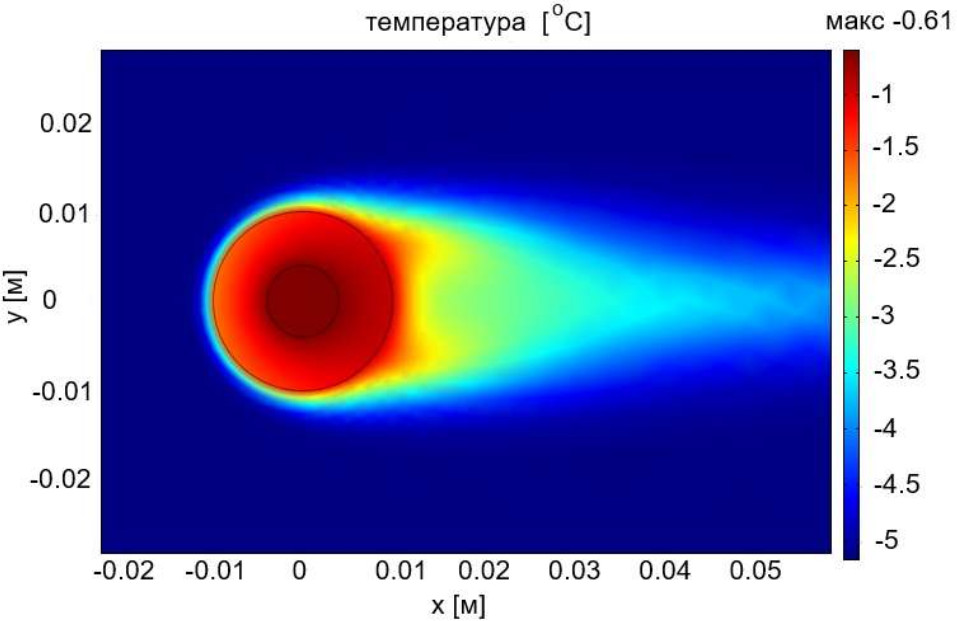 Коэффициенты конвективного теплообмена, найденные тремя способами, существенно отличаются друг от друга. Для более точного представления о характеристиках реального процесса теплообмена нужен физический эксперимент. Однако учитывая геометрические размеры провода и ледяной оболочки, сложно обеспечить качественный результат без возможности искажения тепловых процессов вносимыми датчиками в ледяную оболочку малой толщины. Кроме того, отдельная проблема заключается в процедуре настройки модели гидродинамики. Картина распределения температуры возле провода с ледяной оболочкой свидетельствует о затухании вихревых процессов на небольшом расстоянии, как и было предусмотрено в настройках модели. Однако известные проблемы используемой (k-ε)-модели турбулентности, связанные с поведением потока жидкости (газа) возле поверхности, до конца не преодолены.