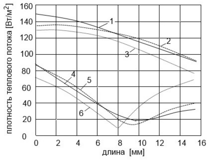 По результатам расчетов построены диаграммы плотности теплового потока и температуры вдоль линии дуги (рис. 3, 4).