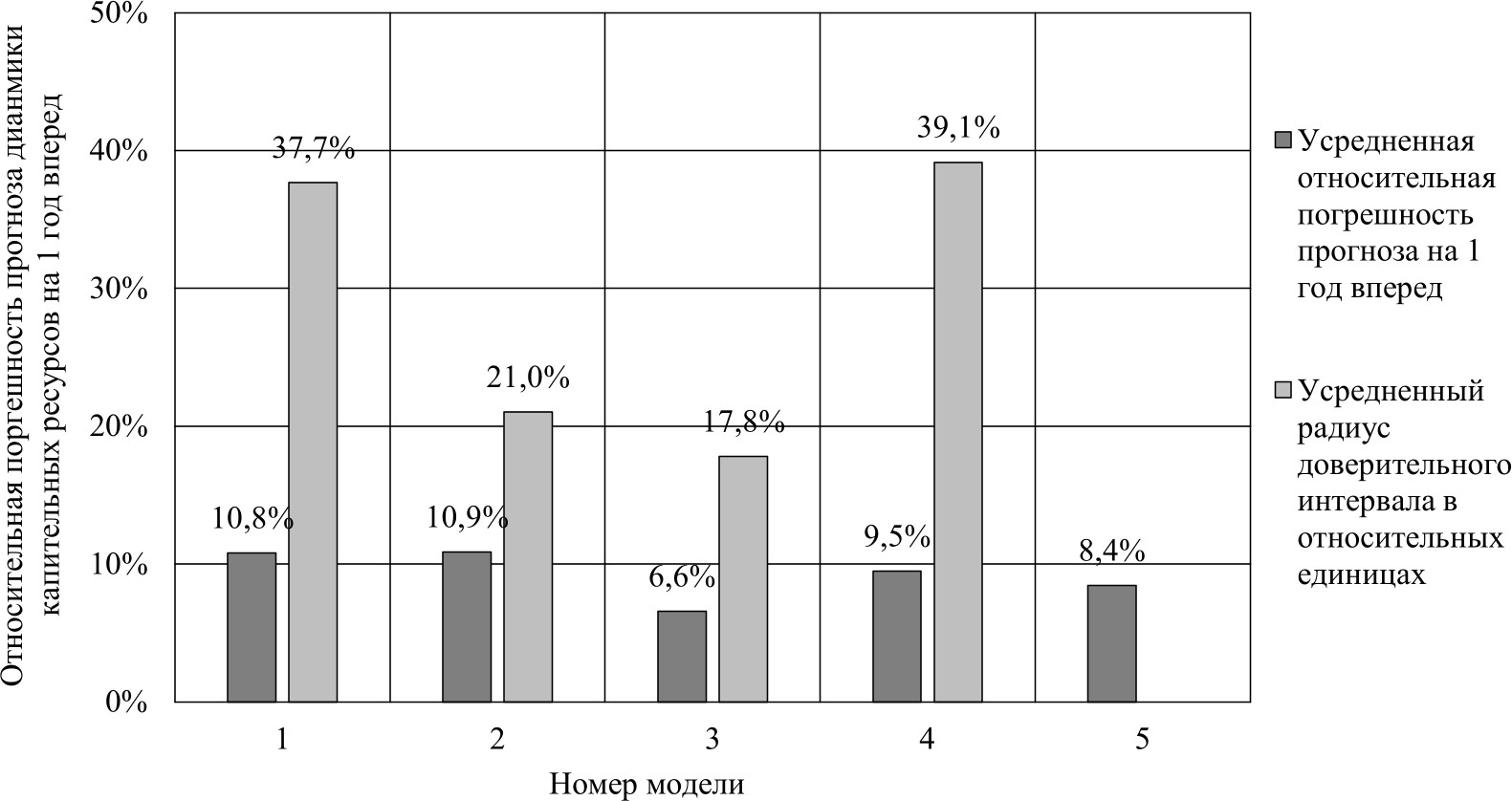 Для окончательного выбора математической модели, описывающей динамику капитальных ресурсов, была проведена оценка погрешностей ретроспективных прогнозов динамики капитальных ресурсов по моделям (2)–(5) на основе статистических данных за 20 лет с прогнозом на 1 год вперед. Усредненные значения относительных погрешностей прогнозов и усредненные радиусы доверительных интервалов в относительных единицах графически отображены на рис. 1 в сравнении с методом Брауна (модель под номером 5) [2, 3].