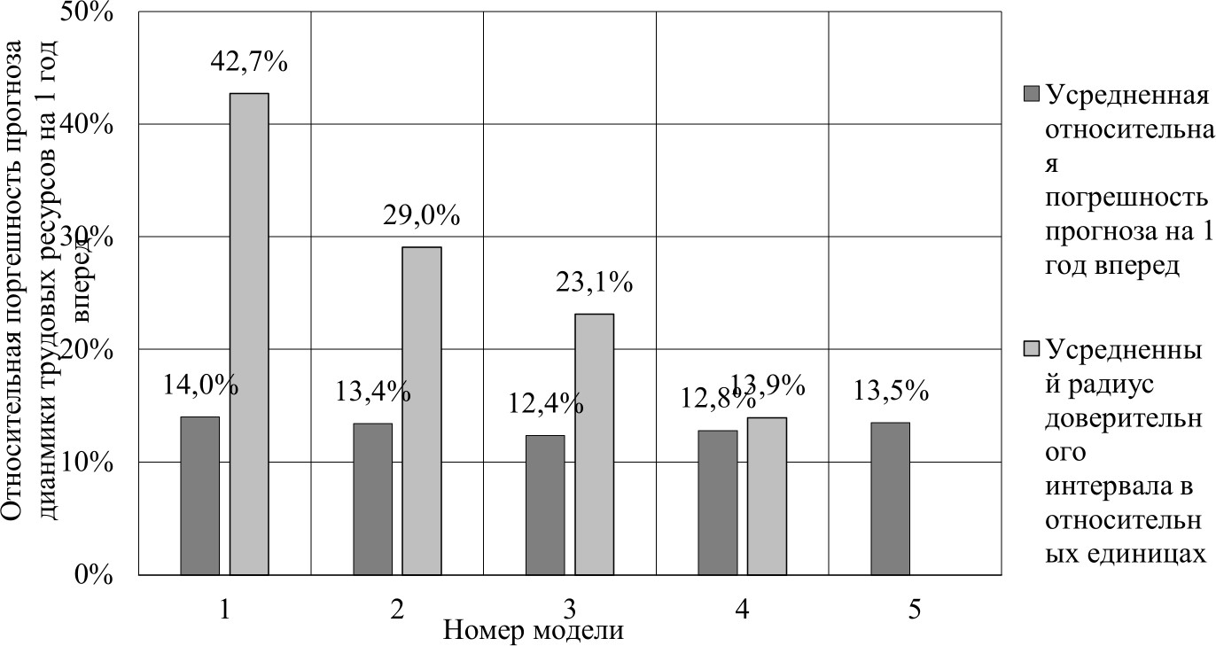 Рис. 1. Сравнительный анализ усредненных значений относительных погрешностей прогнозов и усредненных радиусов доверительных интервалов для моделей (2)–(5)
