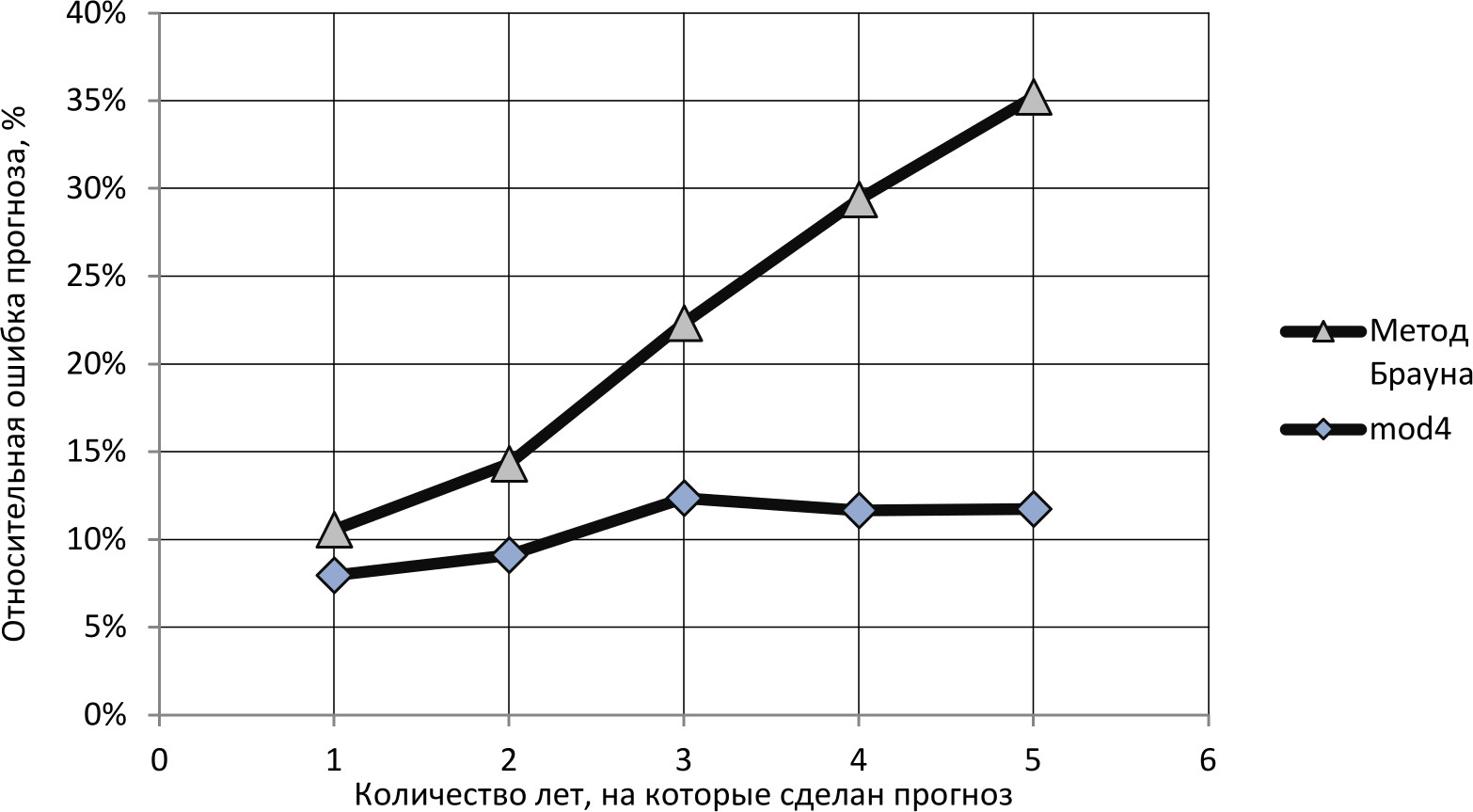 Рис. 2. Значения усредненных погрешностей ретроспективных прогнозов динамики капитальных ресурсов, рассчитанные по модели 3 (формула 4) и методом Брауна