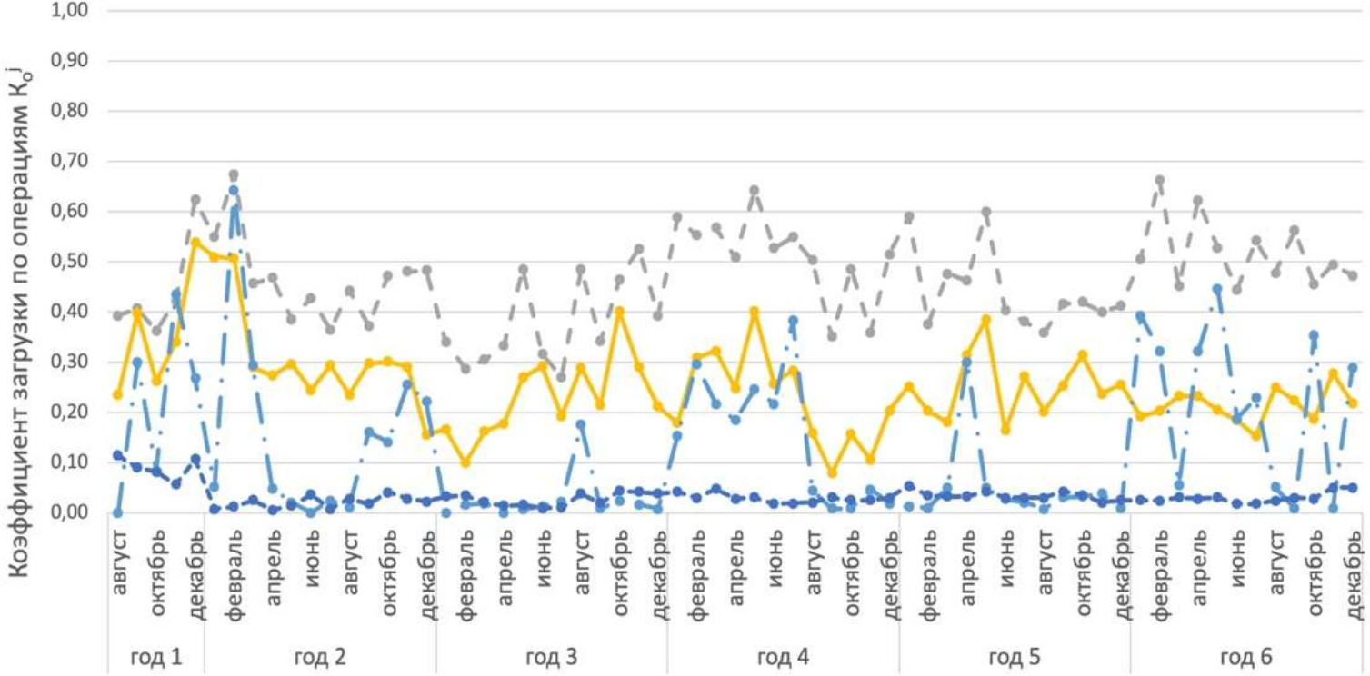 Рис. 2. Коэффициент загрузки оборудования по операциям : ▬●▬ − – химическое оксидирование; ▬●▬ − – хромирование; ▬●▬ − – лужение; ▬●▬ − – травление