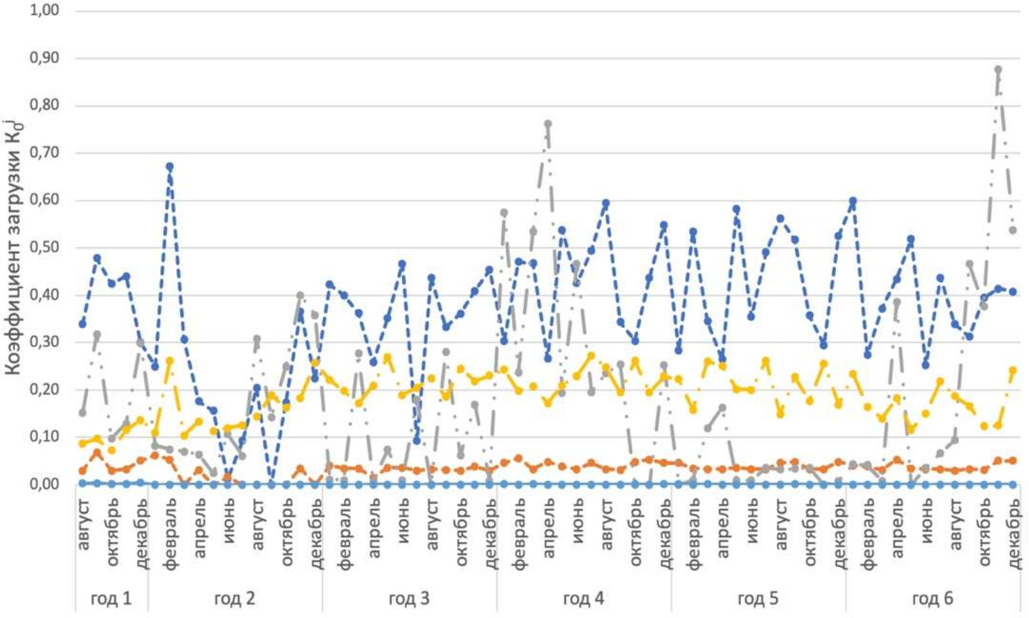 Рис. 3. Коэффициент загрузки оборудования по операциям : ▬●▬ − – хромовокислое анодирование; ▬●▬ − – химическое никелирование; ▬●▬ − – электрополирование; ▬●▬ − – снятие нагара