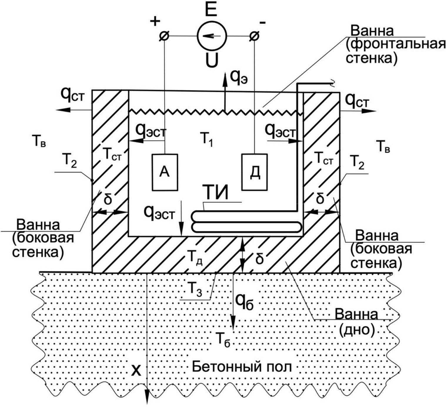 Потери тепла через стенки корпуса ванны. С учетом допущения идеального теплового контакта в стационарном режиме на границе «электролит – стенка» температура на внутренней поверхности стенки будет равна температуре электролита (Т1(tк)).