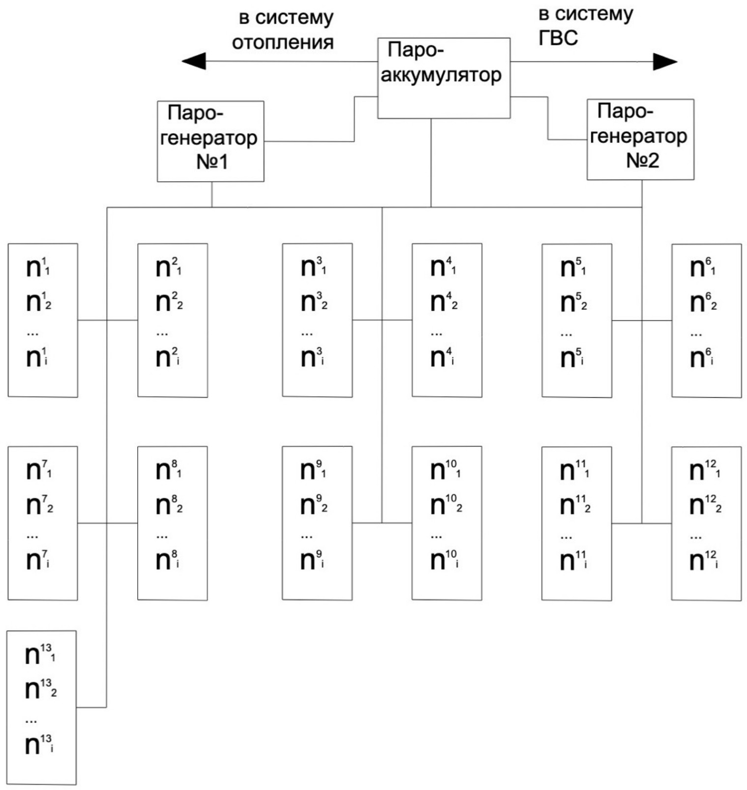 Рис. 8. Схема подключения систем отопления и водоснабжения к газовым парогенераторам: , , …, – ряд ванн, выполняющих операцию химического оксидирования; , , …, – ряд ванн, выполняющих операцию хромирования; , , …, – ряд ванн, выполняющих операцию лужения; , , …, – ряд ванн, выполняющих операцию травления; , , …, – ряд ванн, выполняющих операцию хромово-кислого анодирования; , , …, – ряд ванн, выполняющих операцию химического никелирования; , , …, – ряд ванн, выполняющих операцию электрополирования; , , …, – ряд ванн, выполняющих операцию снятия нагара; , , …, – ряд ванн, выполняющих операцию никелирования; , , …, – ряд ванн, выполняющих операцию хроммолибденирования; , , …, – ряд ванн, выполняющих операцию снятия спецслоя и нагара; , , …, – ряд ванн, выполняющих операцию химического фосфатирования с оксидированием в универсальной гидрофобизирующей жидкости; , , …, – ряд ванн, выполняющих операцию снятия краски