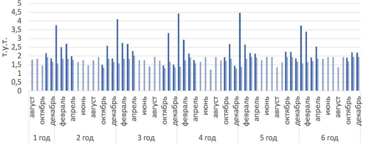Рассмотрим энергетический (рис. 9) и экономический (рис. 10) эффект от внедрения пароаккумулятора для обеспечения равномерности и номинальной загрузки парогенераторов при отпуске невостребованного тепла в систему отопления и ГВС.