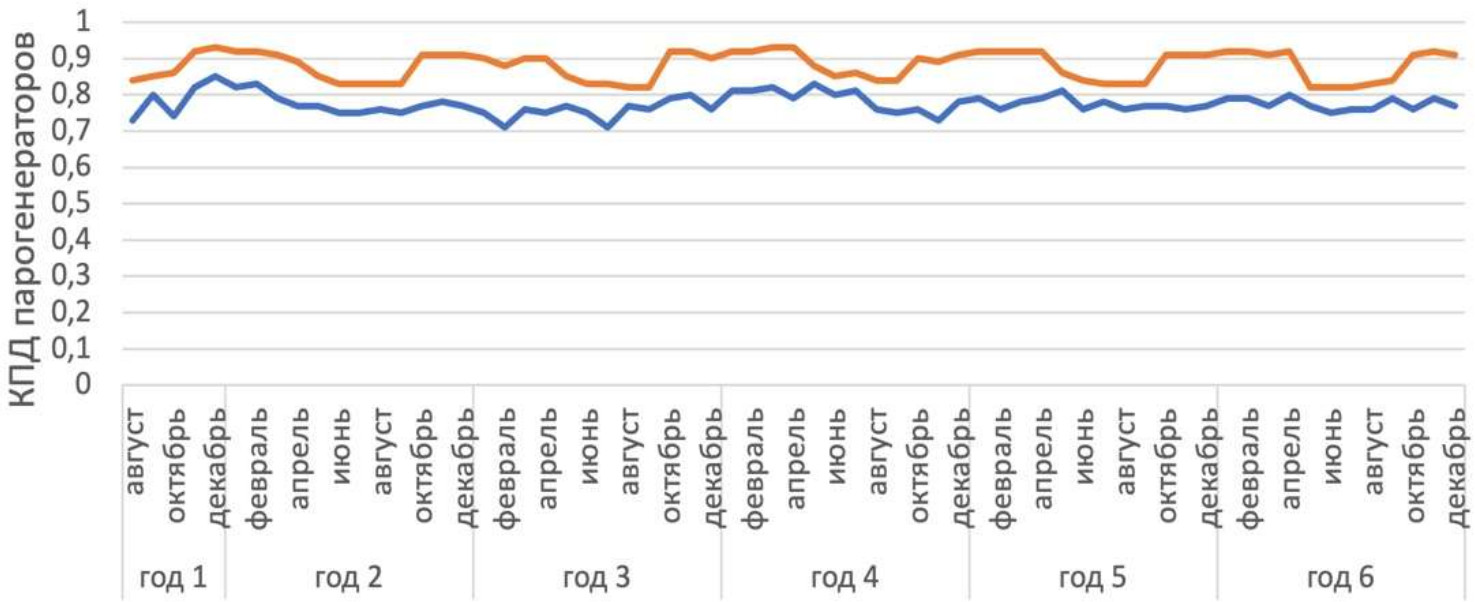 Рис. 11. КПД парогенераторов: ▬ – КПД парогенераторов при исключительном обеспечении технологических процессов; ▬ – КПД парогенераторов при дополнительном снабжении систем отопления и ГВС