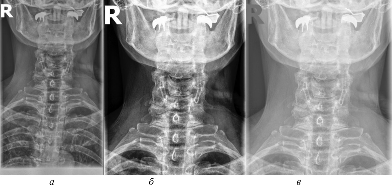 Автоматизированное распознавание таких ключевых анатомических ориентиров на рентгеновских изображениях представляет собой важную задачу, решение которой может повысить точность и скорость медицинской диагностики, обеспечив врачей объективной информацией для принятия решений. Компьютерное зрение способно автоматически локализовывать и идентифицировать анатомические структуры, измерять их размеры и взаимное расположение, а также выявлять отклонения от нормы, указывающие на наличие патологий. Однако недостаточное качество рентгеновских снимков, наличие помех, артефактов и неравномерностей может затруднять их восприятие системами компьютерного зрения. На рис. 1, а продемонстрирован рентгеновский снимок без предварительной обработки.
