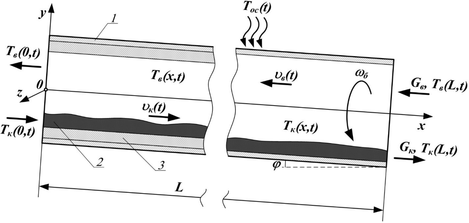 В рамках поставленной задачи с учетом принятых допущений, когда рассматривается динамический процесс теплообмена двух движущихся в противоположных направлениях вдоль продольной оси сред, непосредственно контактирующих между собой, математическое описание может быть представлено следующей системой линейных неоднородных дифференциальных уравнений в частных производных [7]: