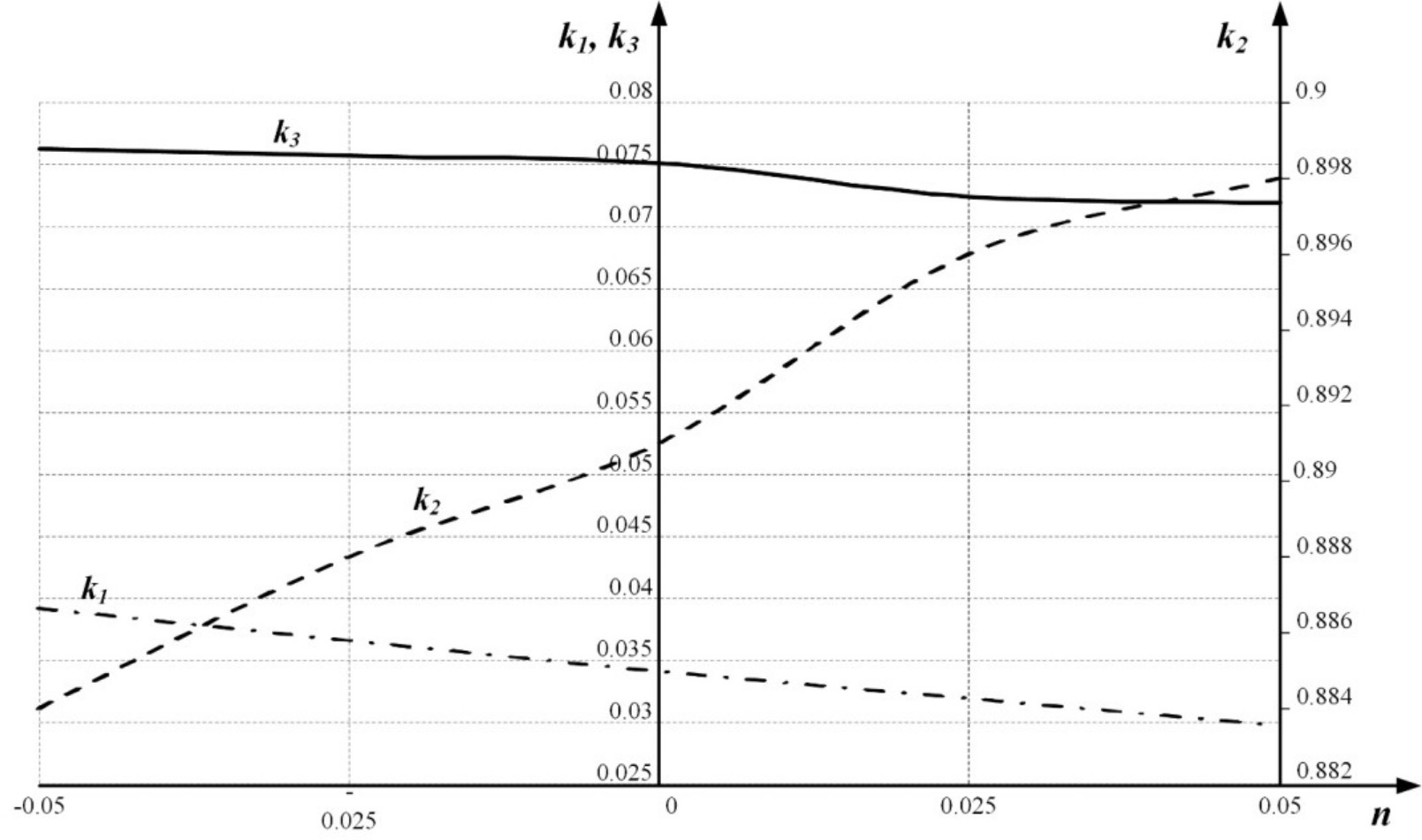 Коэффициенты передачи определены для относительного отклонения скорости воздуха () от номинальной величины общеизвестным методом по значениям логарифмических амплитудных частотных характеристик, соответствующих передаточным функциям , , при нулевой частоте. В качестве рабочей принята скорость воздуха м/с. Зависимость численных значений рассматриваемых коэффициентов от величины приращения скорости воздуха приведена на рис. 2. Анализ полученных характеристик показывает, что коэффициент при уменьшении скорости на 5 % от номинальной возрастает на 15 %, а при увеличении скорости на ту же величину снижается на 12.9 %. Коэффициент имеет аналогичную тенденцию, но при этом уменьшение скорости приводит к его росту лишь на 1.6 %, а увеличение скорости – к снижению на 4.3 %. Для коэффициента имеет место рост при увеличении скорости движения воздуха, однако в рассматриваемом диапазоне его приращение составляет менее 1 %, поэтому он может считаться постоянным. Параметрическая неопределенность, выраженная в виде существенной вариации коэффициента , очевидно, усложняет управление рассматриваемым объектом и должна быть учтена при разработке системы автоматизации процесса охлаждения керамзита для достижения робастной устойчивости [9, 10].