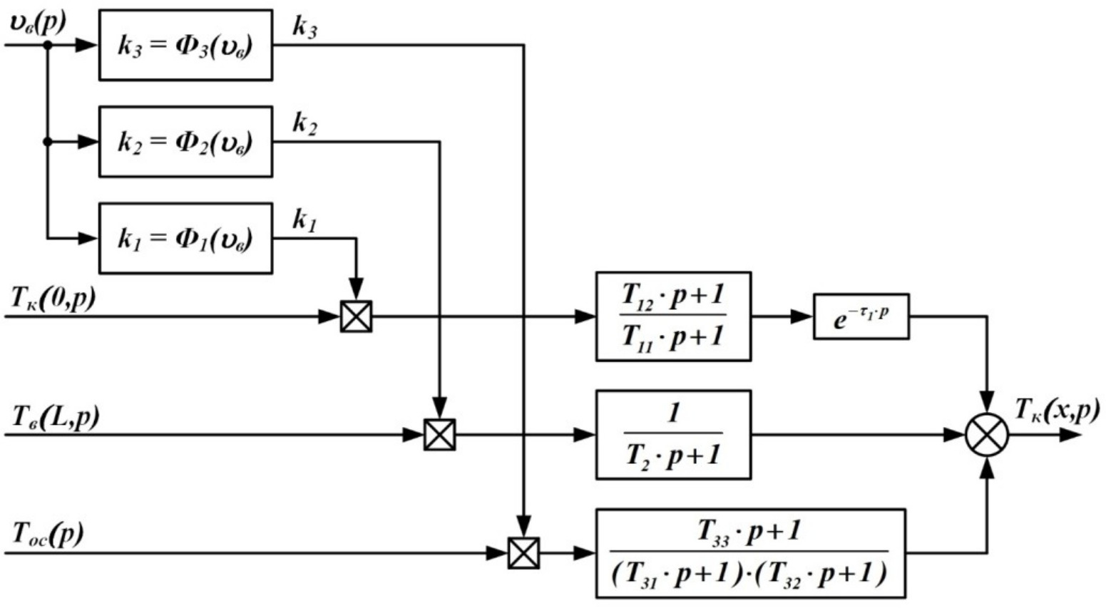 Основной методикой теоретического исследования объектов управления и последующего синтеза систем автоматизации, которая позволяет в удобной форме представить взаимосвязи операторов математической модели и дает возможность упростить решение задачи настройки регуляторов с заранее установленными показателями качества работы, является структурная теория. Воспользуемся выражениями (9)–(12) и построим структурную схему (рис. 3) математической модели процесса охлаждения керамзита в барабанном холодильнике, которая позволит оценить динамику выходной координаты в сечении .