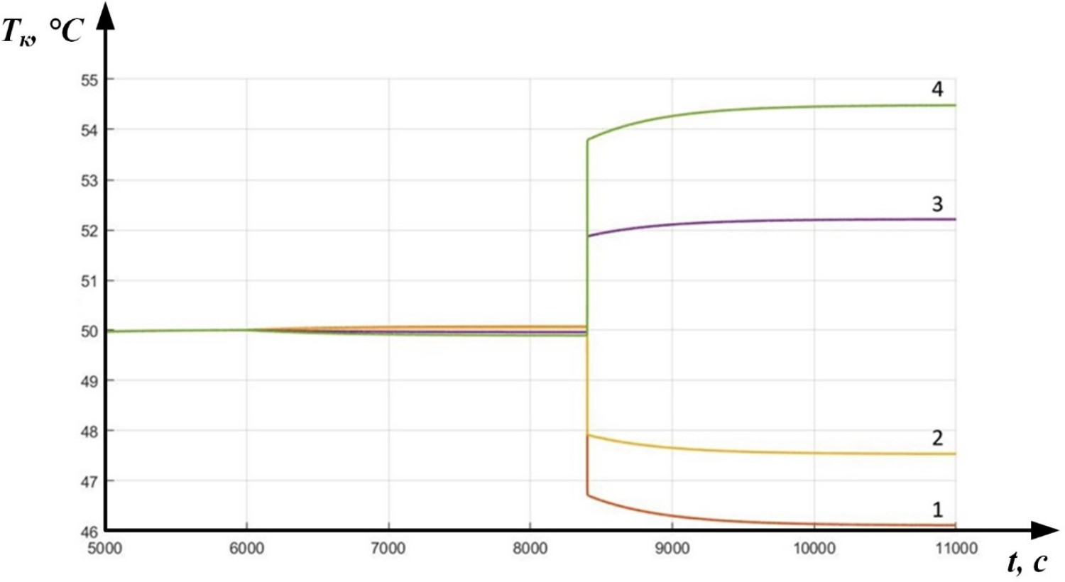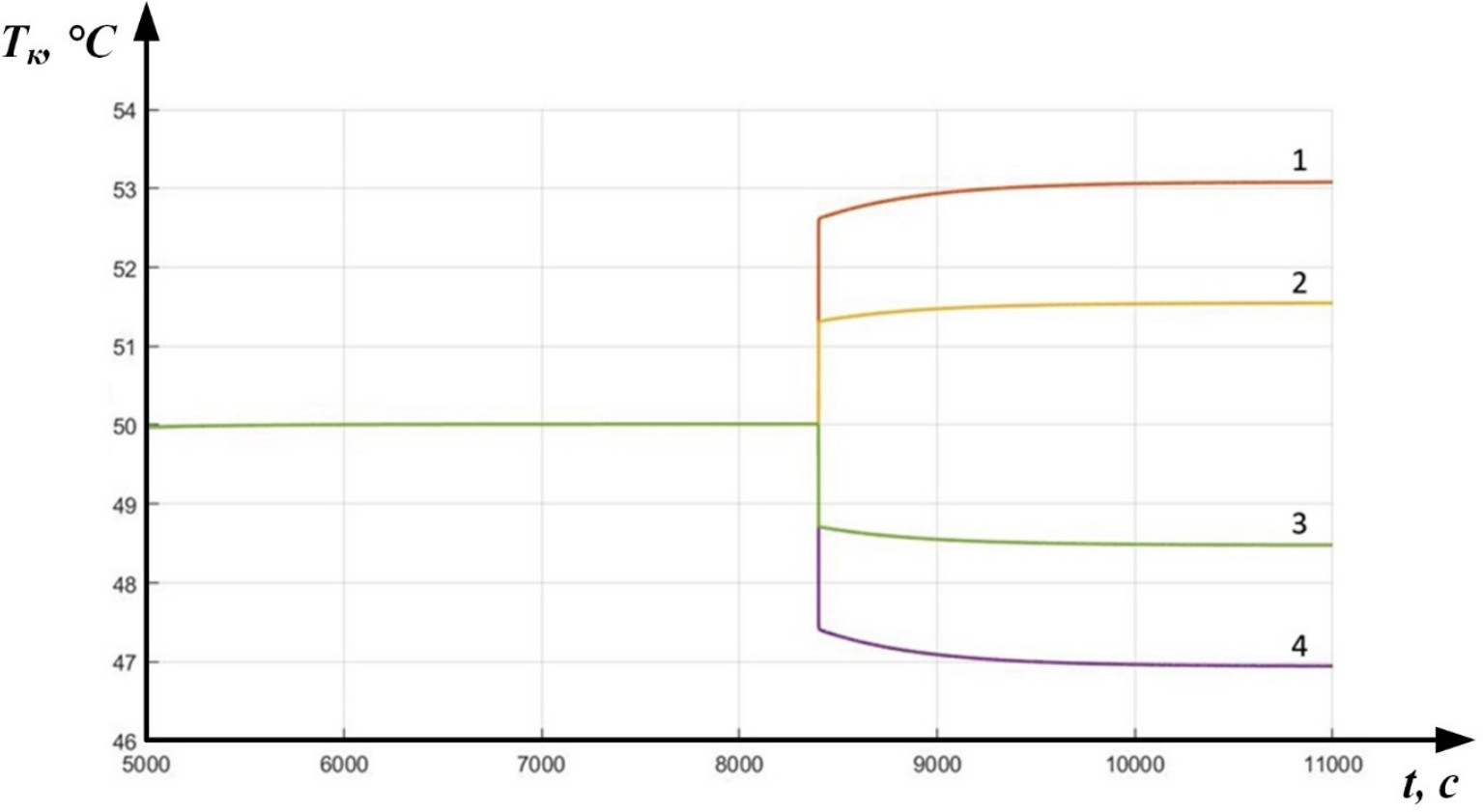 Рис. 6. Переходные процессы в объекте управления по отношению к возмущающему воздействию: 1 – ΔТк.вх=0.1Тк.вх0; 2 – ΔТк.вх=0.05Тк.вх0; 3 – ΔТк.вх=-0.05Тк.вх0; 4 – ΔТк.вх=-0.1Тк.вх0