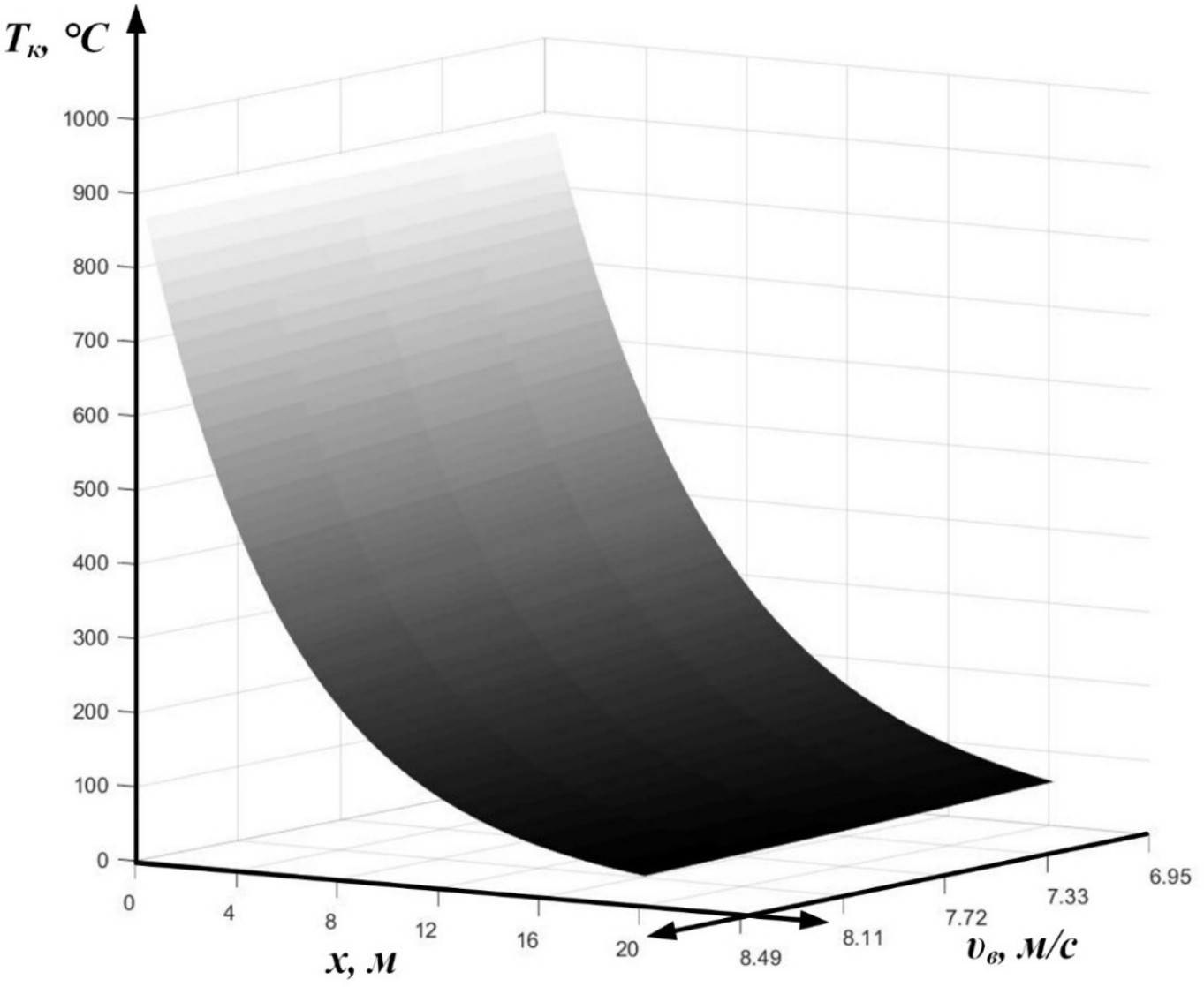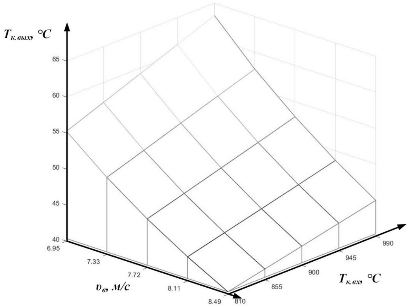 Построим статическую характеристику объекта управления путем соотнесения установившихся значений выходной координаты с величинами управляющих и возмущающих воздействий из технологически обоснованного диапазона (рис. 8). Такая трехмерная поверхность представляет собой нелинейную функцию и в практике эксплуатации барабанного холодильника может использоваться как регулировочная характеристика, которая позволит определить требуемую скорость υв движения охлаждающего воздуха для получения заданной температуры керамзита на выходе холодильника при определенном значении температуры материала на входе установки.