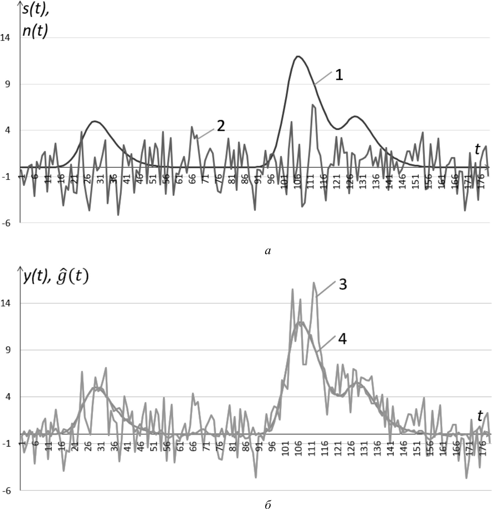 Рис. 1. Корреляционная обработка хроматограмм: а – сигнал от однократного ввода пробы: 1 – s(t) без наложенной помехи; 2 – высокочастотная помеха n(t) (σn=2); б – 3 – сигнал y(t) с наложенной помехой при однократном вводе пробы; 4 – усредненный хроматографический сигнал g(t) на множестве вводов проб: p=90