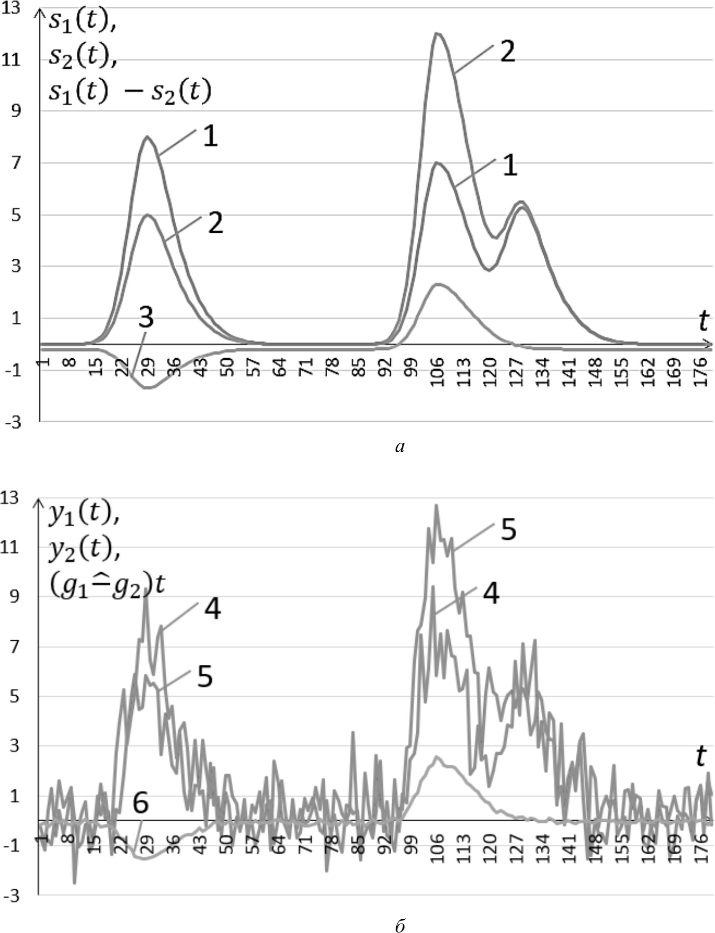 Рис. 2. Дифференциальная хроматограмма: а – 1 – сигнал без помехи s1(t) от однократного ввода пробы первого образца; 2 – сигнал без помехи s2(t) от однократного ввода пробы второго образца; 3 – разностный сигнал s1(t)-s2(t); б – 4 – сигнал y1(t) с наложенной помехой (σn=2) от однократного ввода пробы первого образца; 5 – сигнал y2(t) с наложенной помехой (σn=2) от однократного ввода пробы второго образца; 6 – усредненный разностный сигнал (g1-g2)t: p=90 для первого образца, p=89 для второго образца