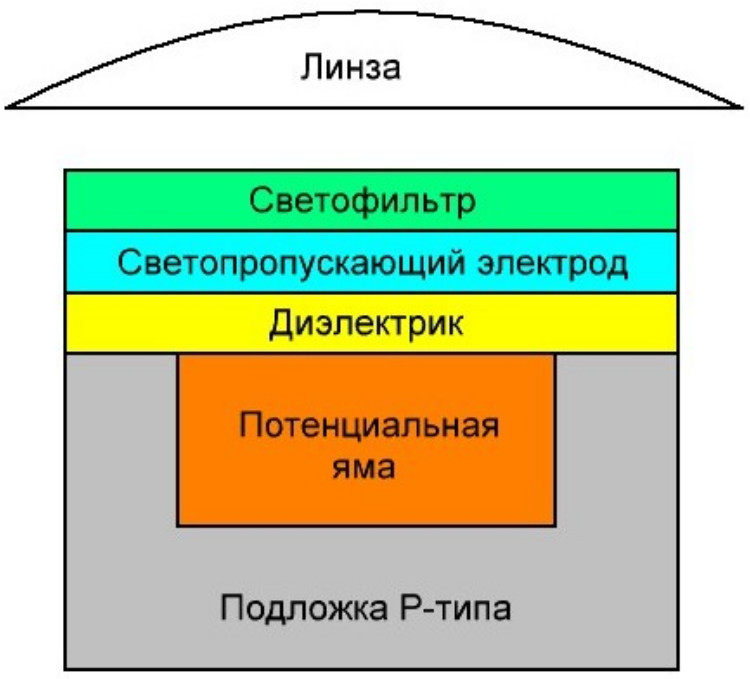 Принцип работы ПЗС пикселя заключается в следующем. Свет через линзу собирается в равномерный пучок и проходит через светофильтр (красный / синий / зеленый). После светофильтра отфильтрованный свет проходит на светопропускающий электрод. Диэлектрик имеет прозрачную структуру, которая пропускает свет на кристалл. На верхней части кристалла подается положительный потенциал. Падающий свет проникает внутрь полупроводниковой структуры, и образуется электрон-дырочная пара. Электрическое поле разделяет появившуюся пару, электрон попадает в зону хранения (потенциальную яму), а дырка – в подложку. В итоге заряд перемещается по каналам вертикального и горизонтального переноса зарядов.