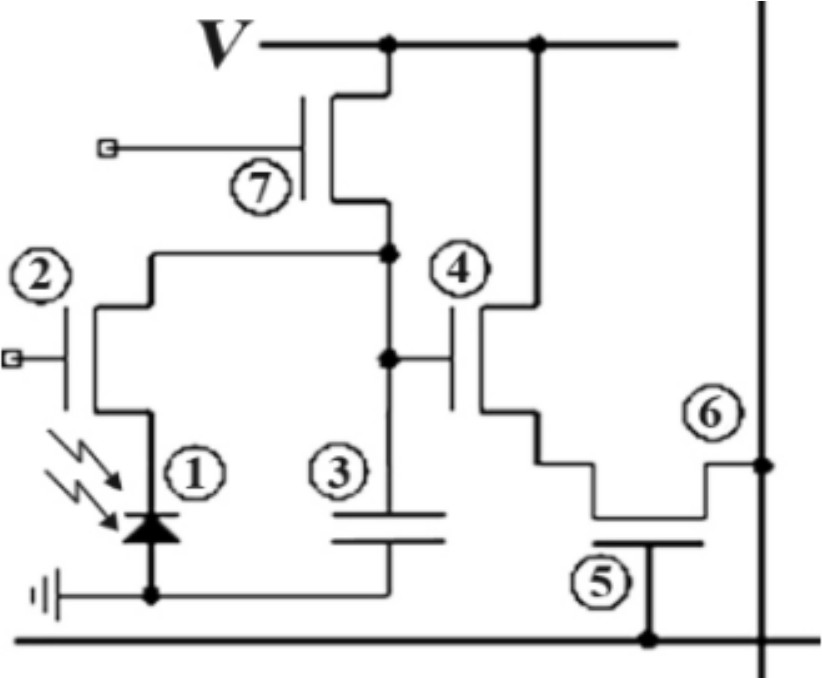 Рис. 2. Структура КМОП пикселя: 1 – фотодиод; 2 – электронный затвор; 3 – конденсатор, накапливающий заряд с фотодиода; 4 – усилитель; 5 – шина выбора строки; 6 – вертикальная шина вывода информации; 7 – управляющий вывод сигнала сброса