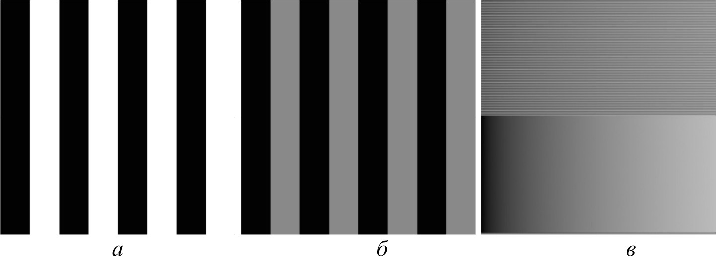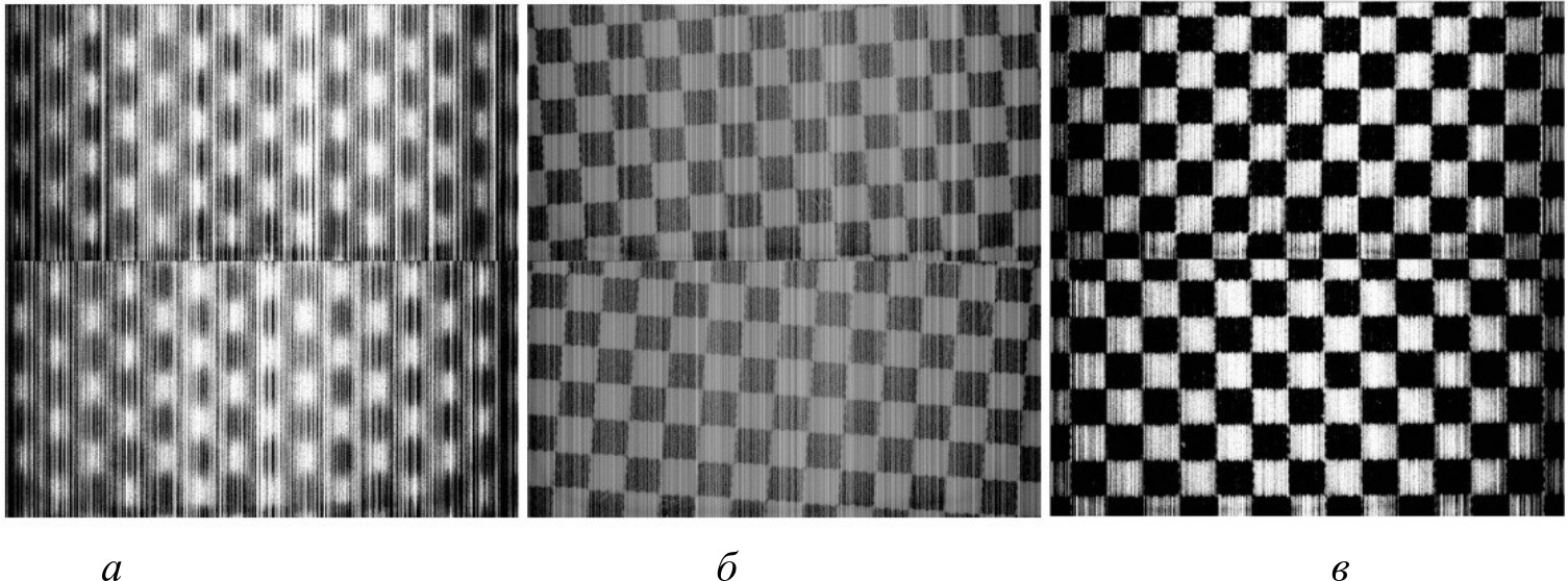 Рис. 10. Снимок фотошаблона без оптической системы: а – высокое опорное напряжение; б – низкое опорное напряжение; в – среднее опорное напряжение