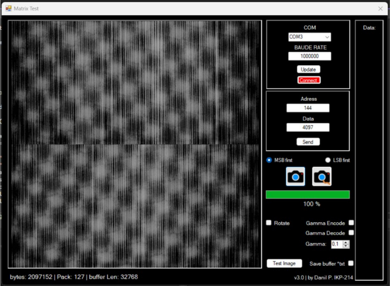 Для отладки работы системы захвата изображения была написана программа на языке C# с возможностью контроля поступающего изображения и изменения потока данных в реальном времени, а именно: поворот и совмещение двух половин изображения (поскольку матрица выдает изображение двумя зеркальными половинами), гамма кодирование/декодирование, переключение MSB/LSB пакета (рис. 9). Протокол прописан в рамках обмена данными между ПЛИС и ПК. Слева добавлена область по контролю пришедших данных. Алгоритм работы следующий: